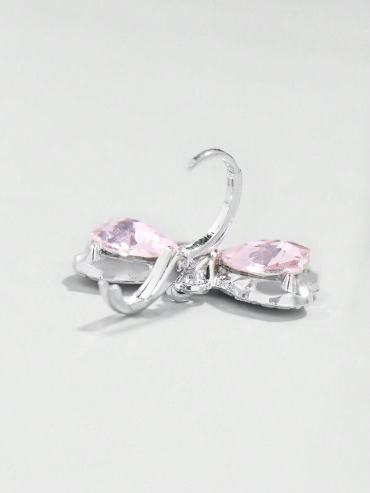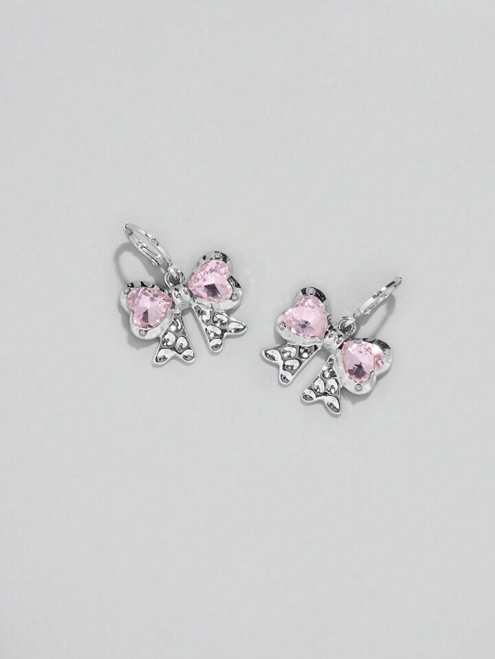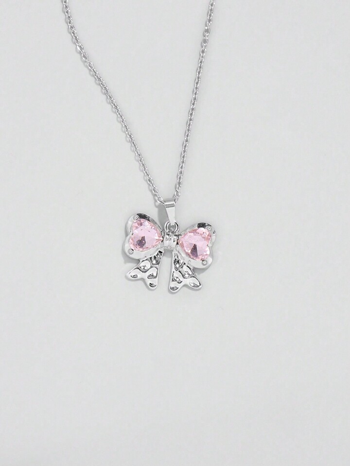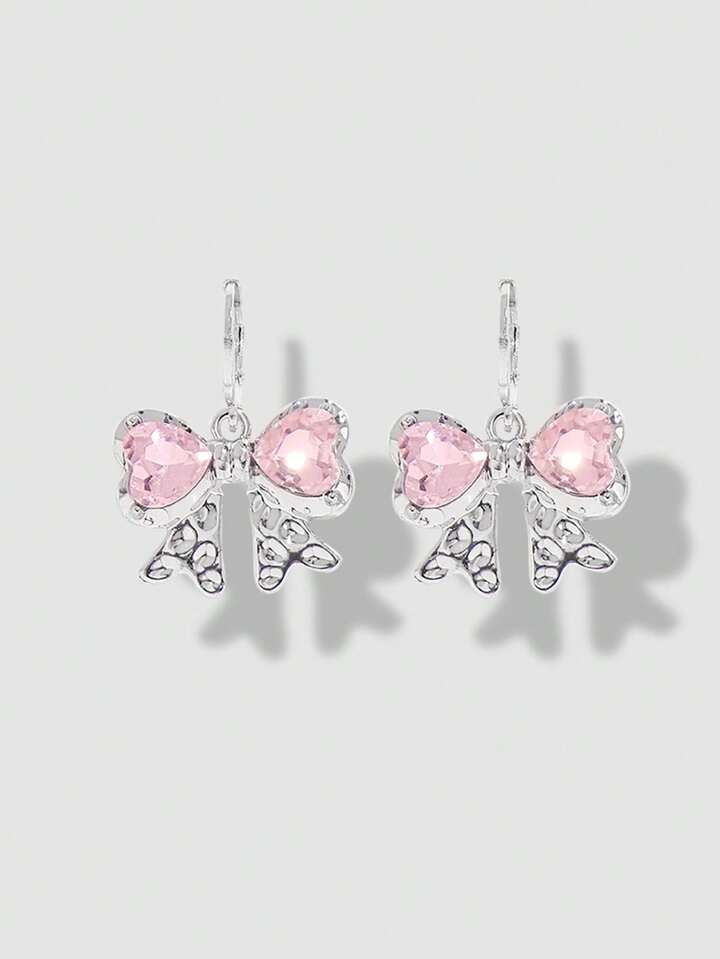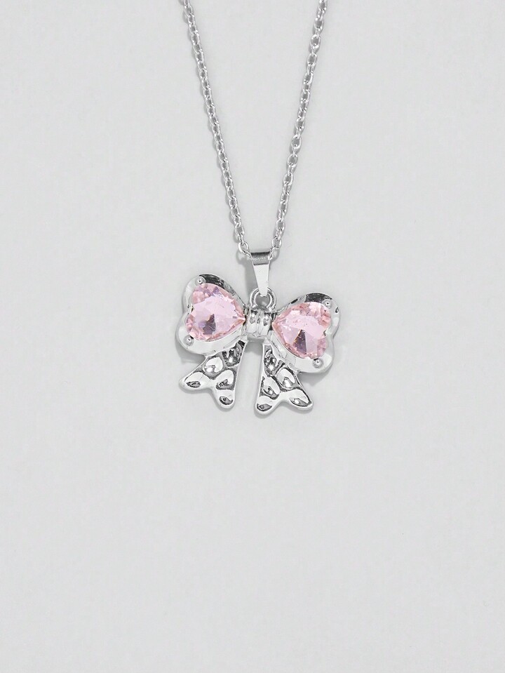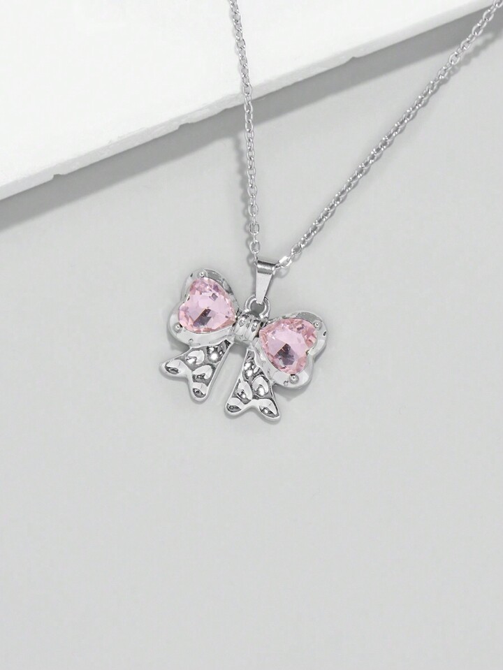 Kawaii 1 Set Mädchens rosa herzförmiger Glas Kristall Anhänger Edelstahl Kette und Kupfer Ohrringe Set mit Schleifen Design