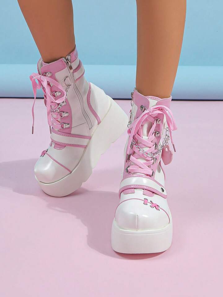 Kawaii 2024 Damen Neuer Frühlings- Und Herbststil Mit Runder Spitze, Niedlichem Rosafarbenem Herzdetail, Punk-stil Mit Klobigem Absatz Und Modischen Stiefeletten Mit Dicker Sohle