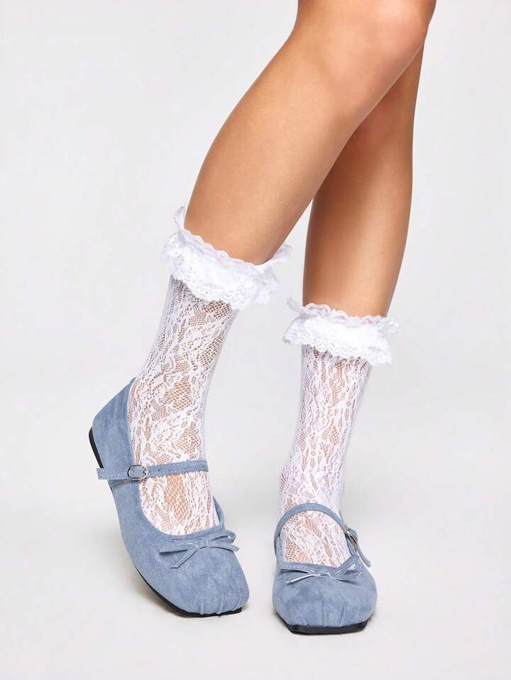 Kawaii 2025 neue Ballettflache Schuhe in Große Größen für Damen, süße Schleifenapplikation, Obermaterial aus Samt, quadratische Zehenform, Lässig Frühling Herbst Blaue Flache Schuhe