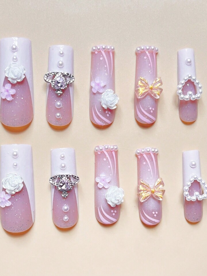 Kawaii 24 Stücke Lang Sargförmig 3D Blumendekor Kunstnagel & 1 Stück Nagelfeile & 1 Blatt Klebeband
