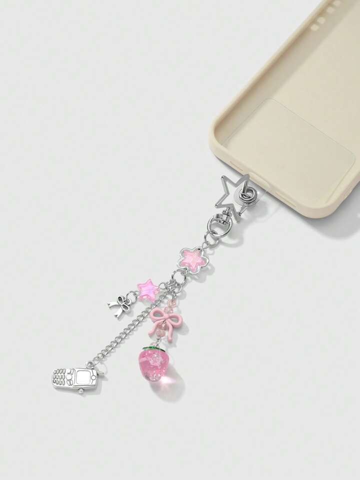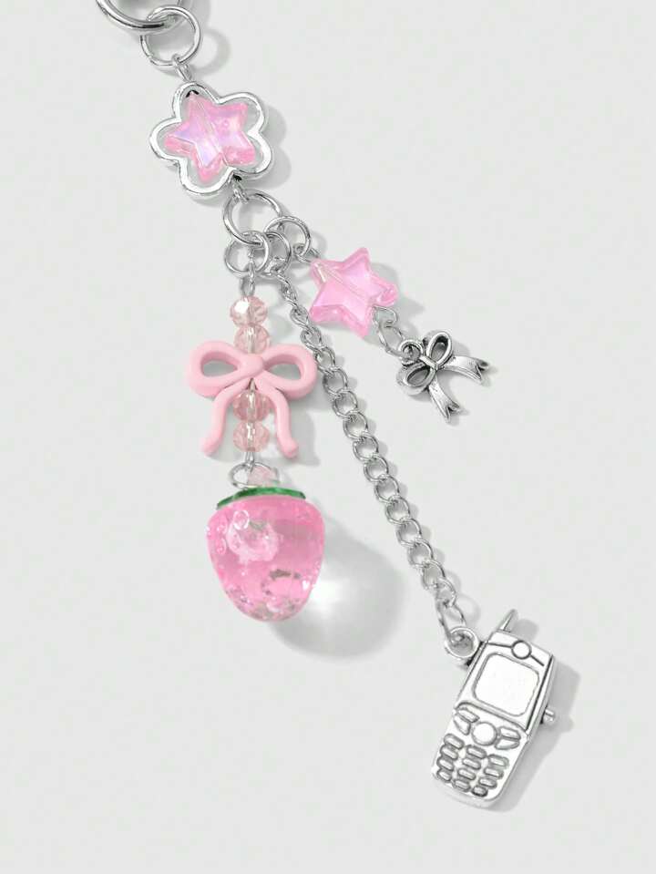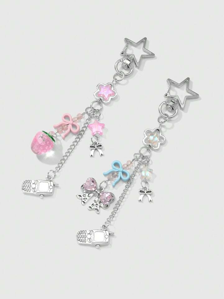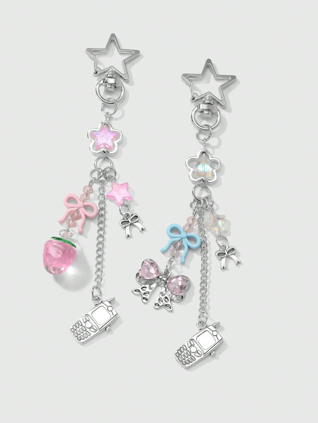 Kawaii 2 Stücke koreanischer Stil hochwertige Halskette und Schlüsselanhänger Set mit ausgehöhlten Blumen, Sternen, Erdbeeren und Kristallbögen aus Harz, geeignet für Paare, beste Freunde, Alltagsmode, als Geschenk