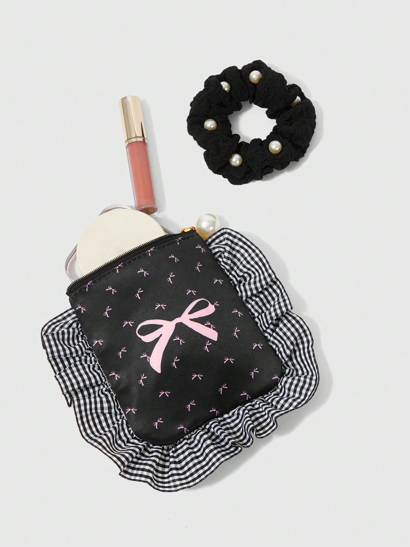 Kawaii 2 Stücke/Set süßer karierter Spitze Vollaufdruck Schleife Design große Kapazität tragbare Aufbewahrungstasche & Make-up Tasche mit Haargummi