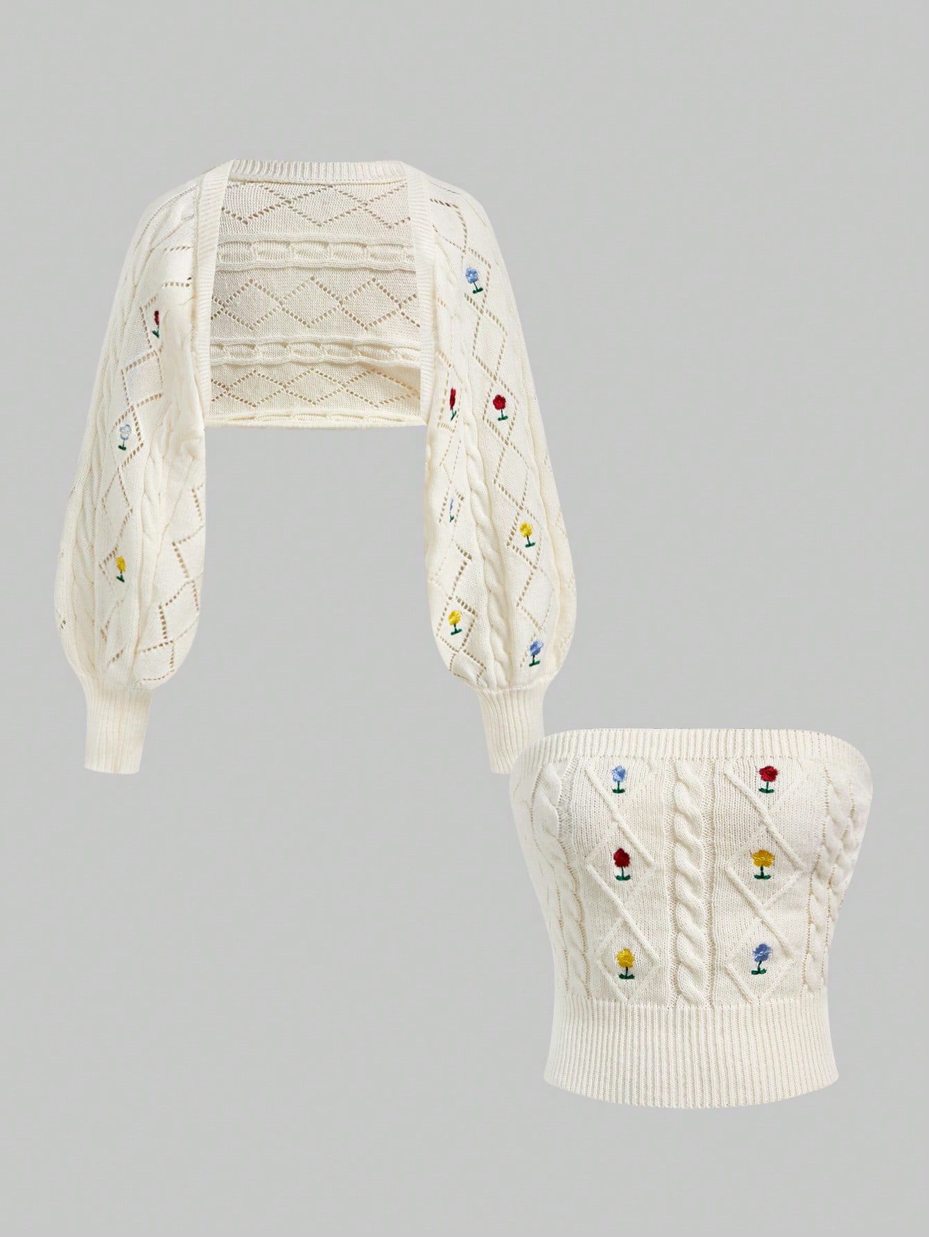 Kawaii 2 Stück/Set süßer rosa bestickter Bindebanddekor weicher Strickpullover Set - Bandeau-Top + kurze Strickjacke, Weihnachten & Neujahr
