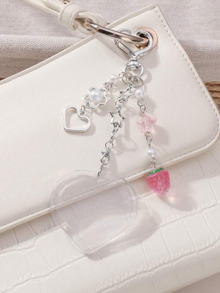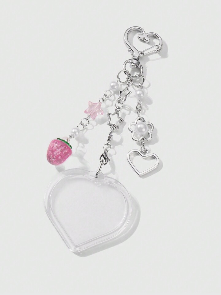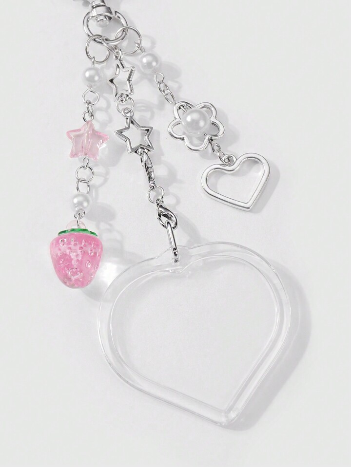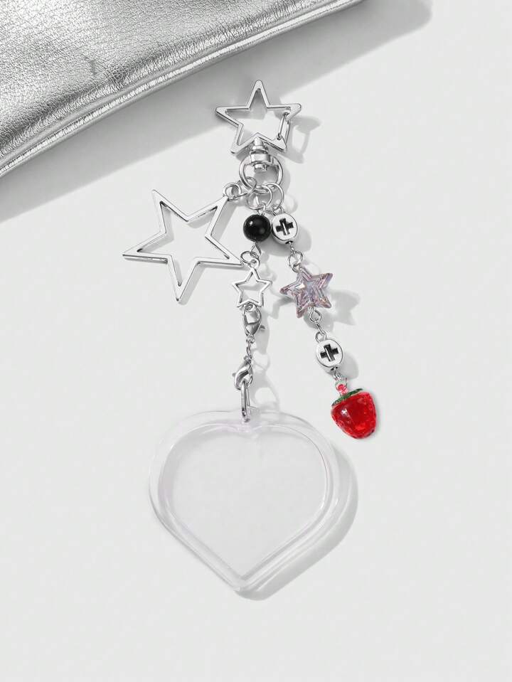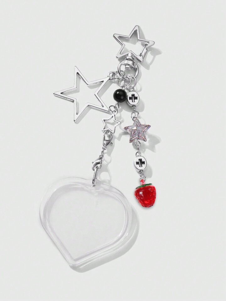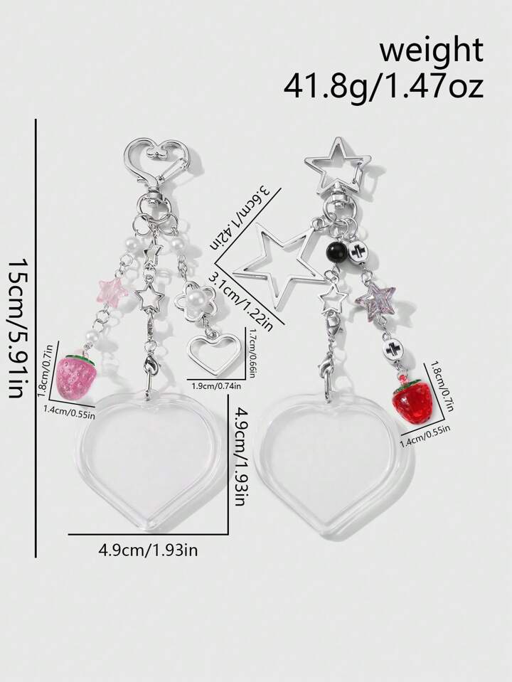 Kawaii 2 Stücke Y2K Chic minimalistischer vielseitiger hochwertiger Silber Stern Kette Anhänger, Kunstperlen Erdbeere Herz Acryl Foto Rahmen Schlüsselanhänger Taschenbaumler, Kombinations-Set, geeignet für Paare, beste Freunde, Schwestern, Alltagstragen, Urlaubsgeschenk