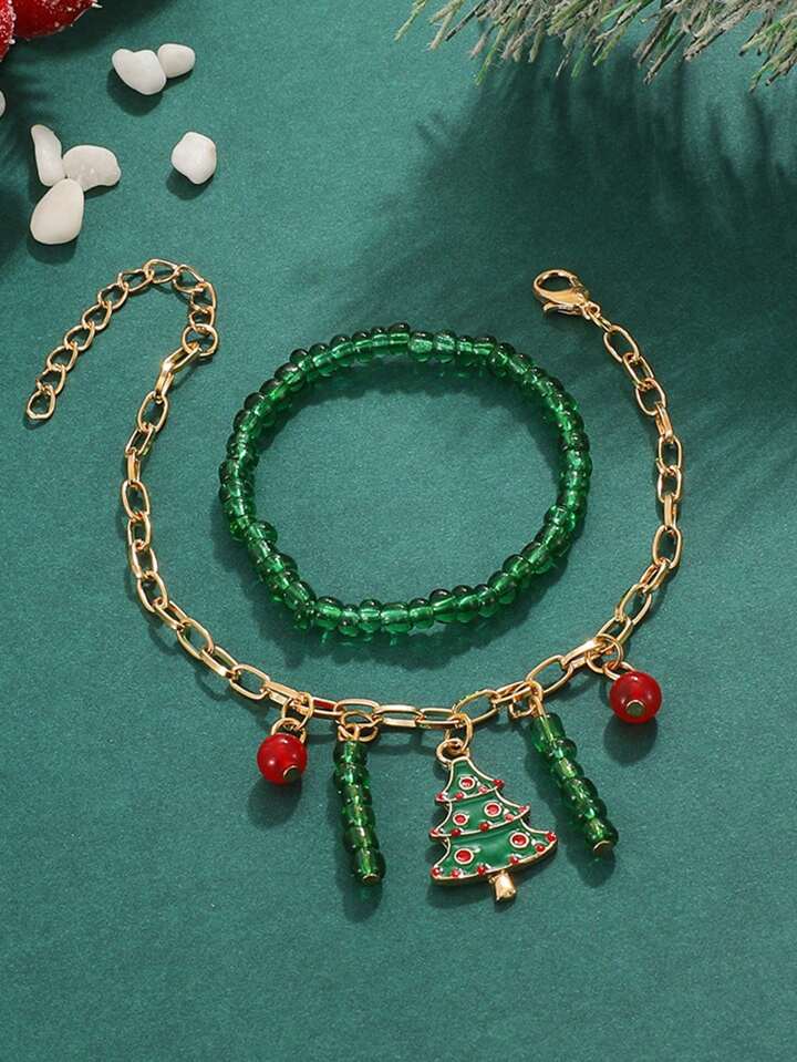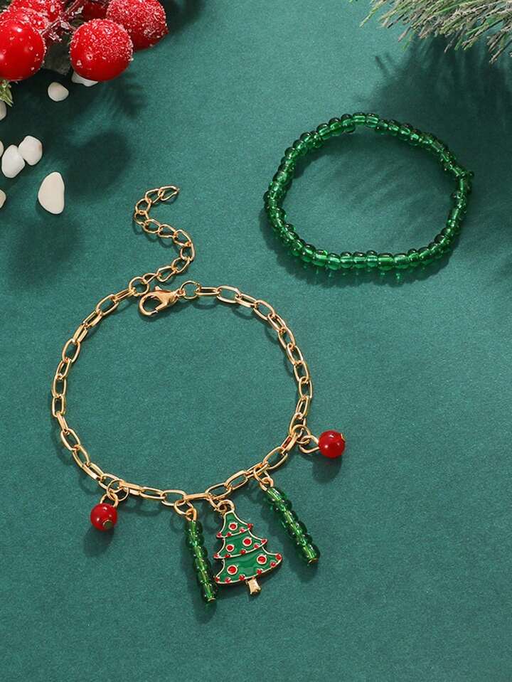 Kawaii 2 Stücke/Set Perlen und Baum Charm Weihnachtsarmband Set
