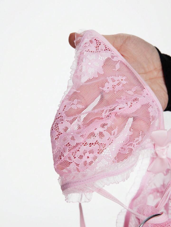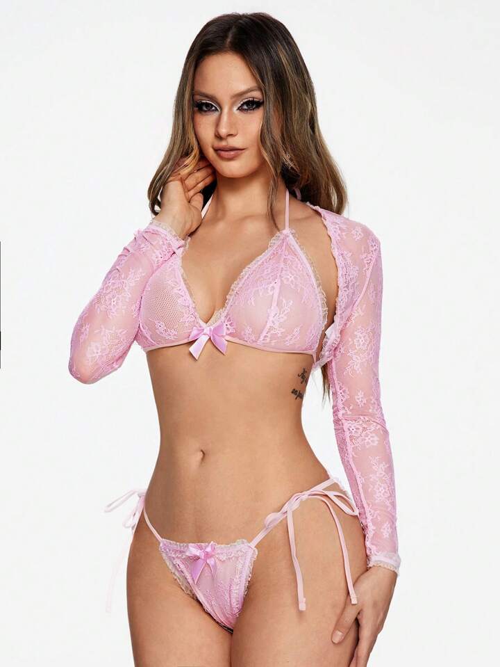 Kawaii 3 Stücke/Set Himekaji romantisches Valentinstags bügellos-Spitzen-Dreieckskörper Träger Schleifen Dekor Negligé mit langen Ärmeln, Sexy Dessous Set