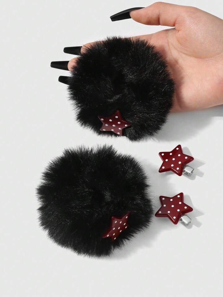 Kawaii 4 Stücke Gothic-Stil flauschige Haargummis + Acryl Farbverlauf Stern Haarspangen & Haarklammer Set, Accessoires Geschenk für Frauen