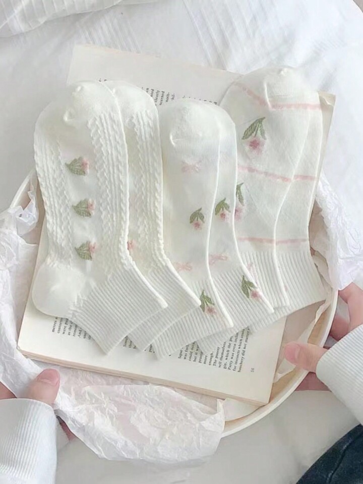 Kawaii 5 Paar niedliche Kurzsocken für Frauen mit Schleifen und Blumenmuster, japanischer Stil 3D Socken
