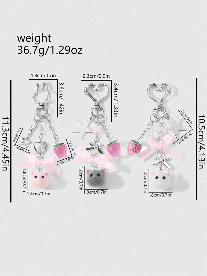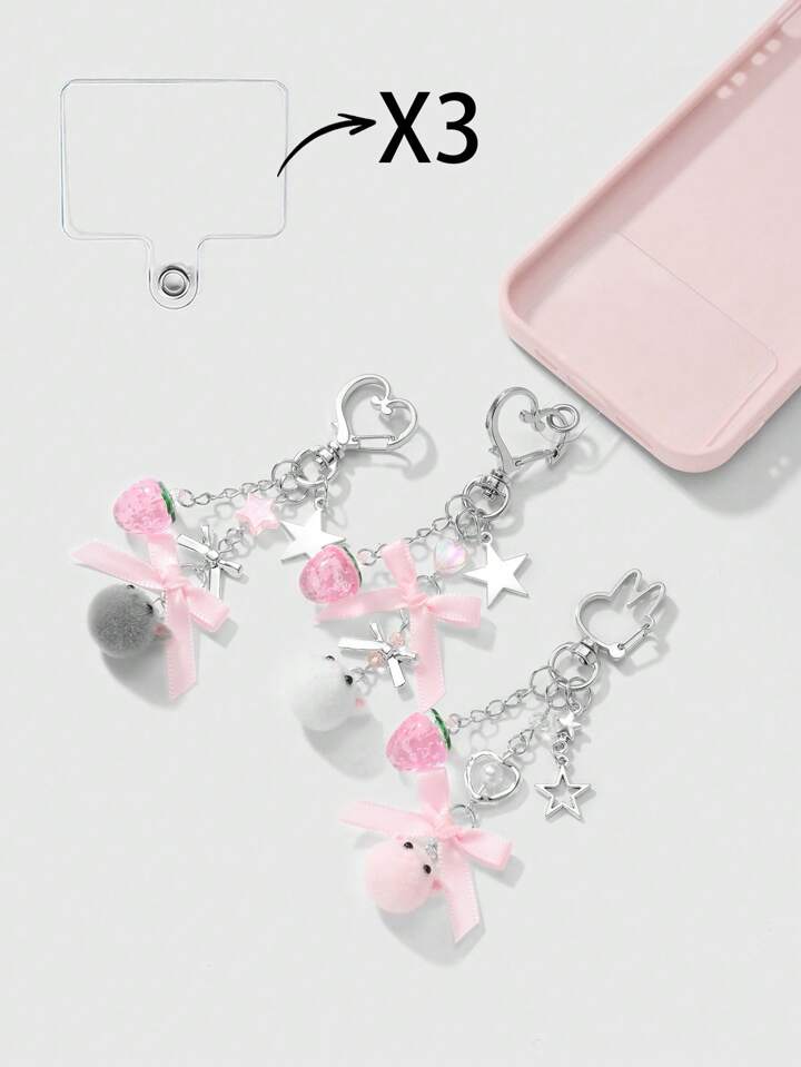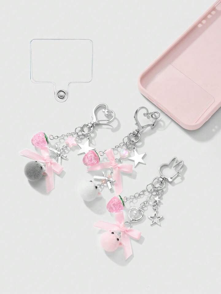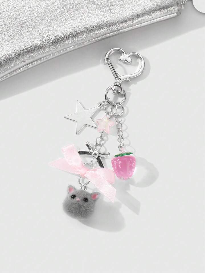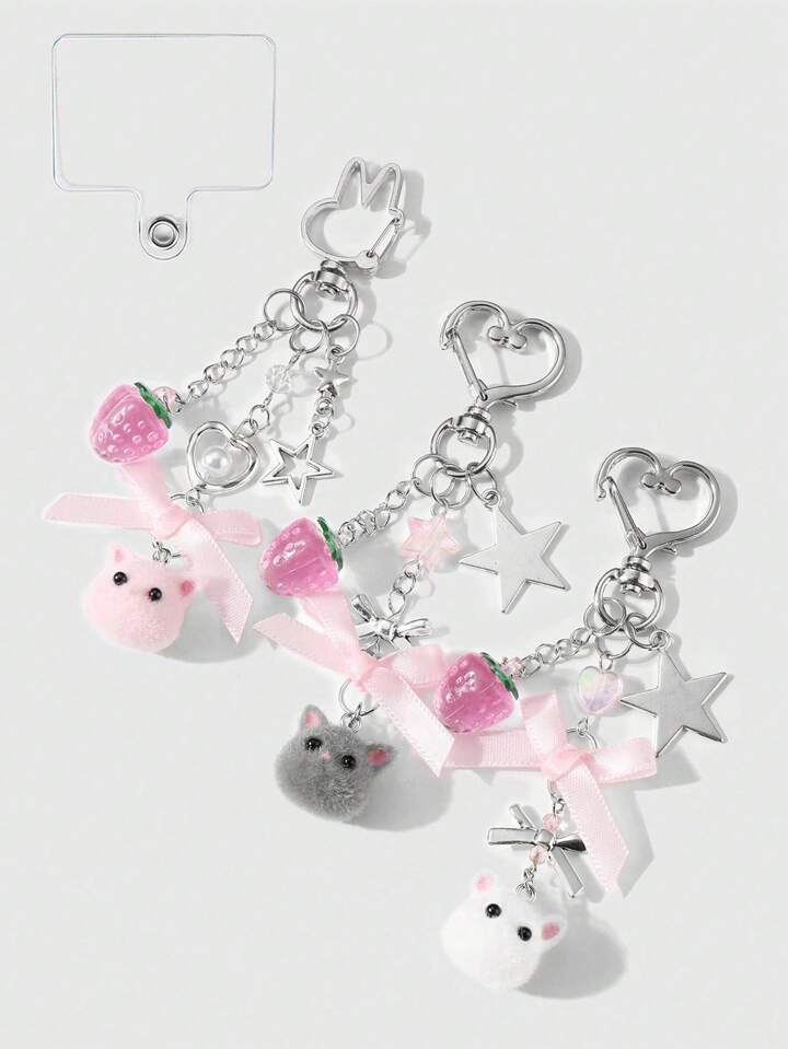 Kawaii 6 Stücke elegantes und süßes Silber-Ketten-Set mit Stern, Erdbeere, Schleife, Samtkatzen-Kopf Anhänger + transparenter Handy-Karten zum Selbstbasteln, ideal als Geschenk für Schwestern, Freundinnen, Paare für den Alltag oder Feiertage