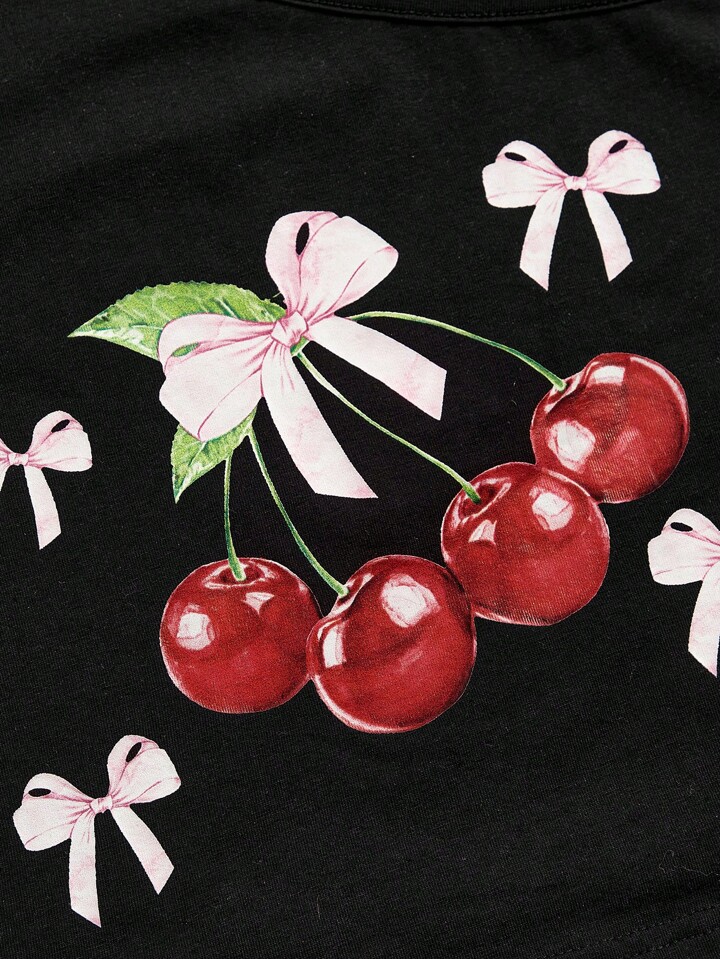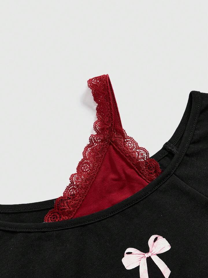 Kawaii Asymmetrisches Schulter T-Shirt mit Spitzenbesatz, Kirsch- und Schleifen-Muster, Schule