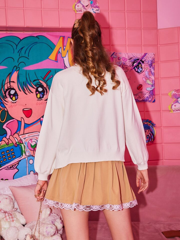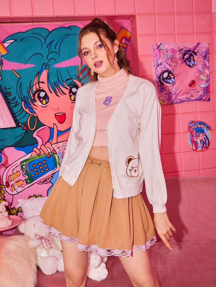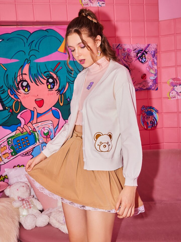 Kawaii Cardigan mit Cartoon Bären Stickerei, Knopf vorne