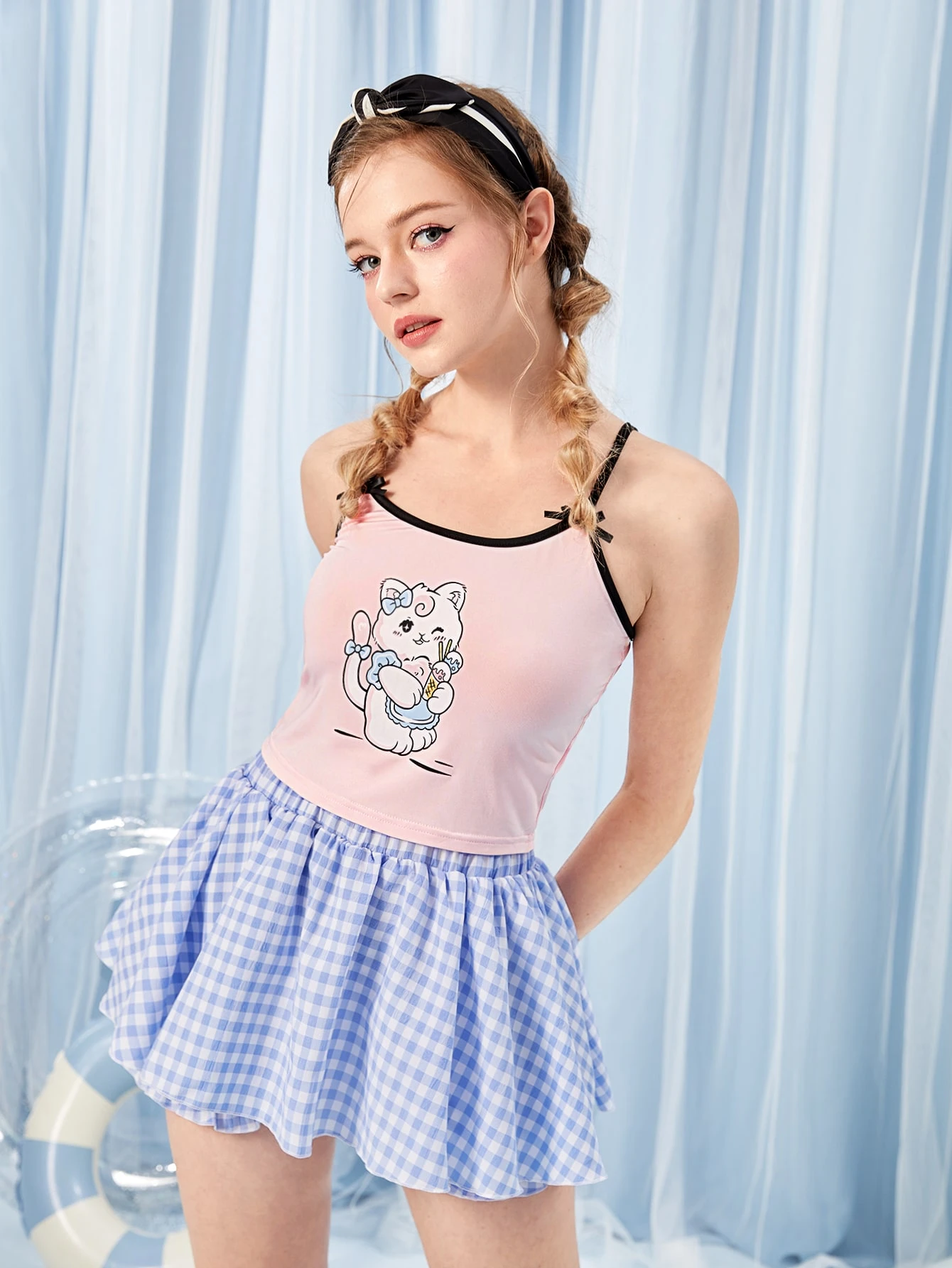 Kawaii Cami Top mit Cartoon Grafik, Kontrastsaum,