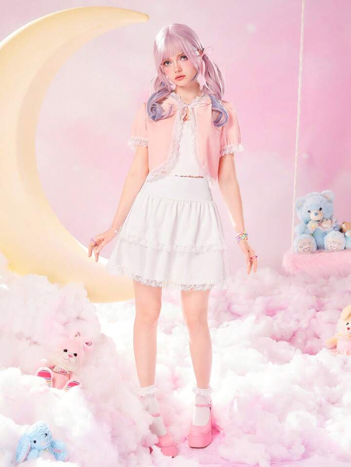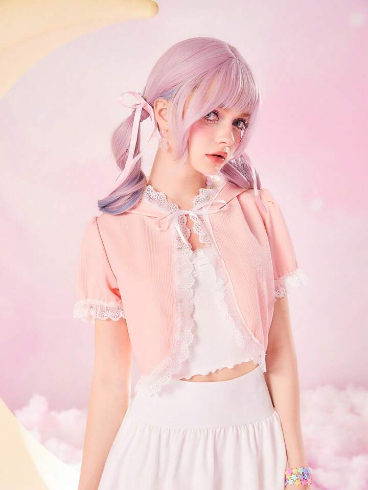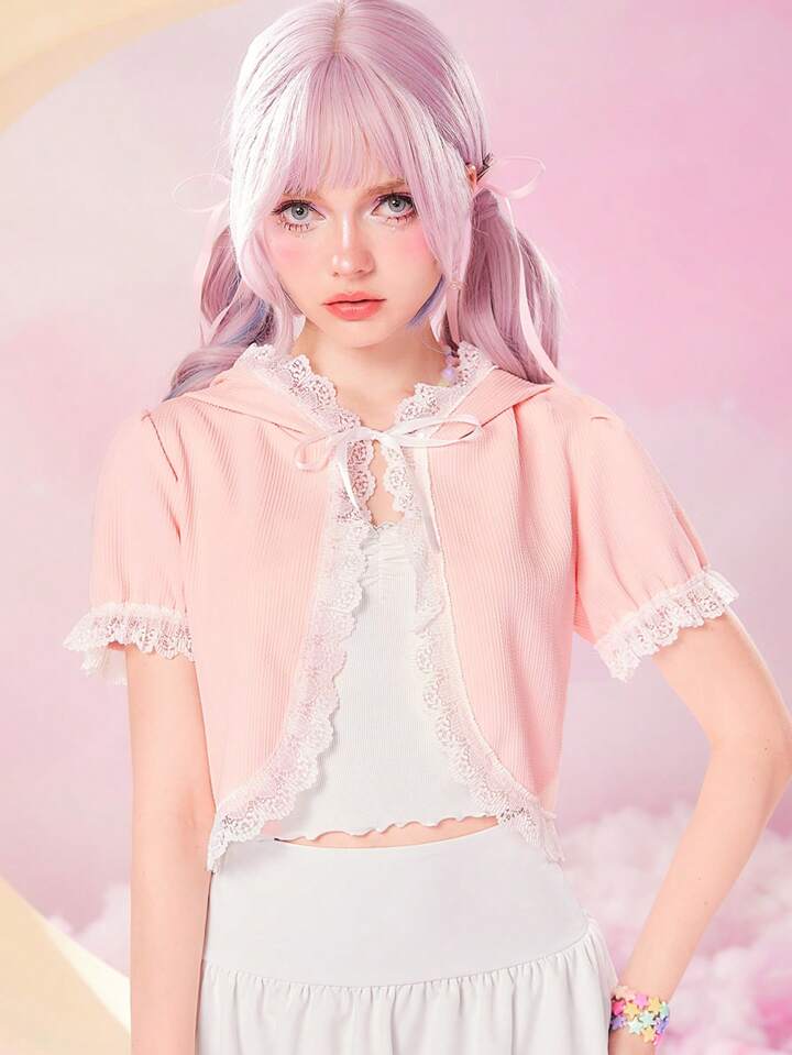 Kawaii Oberteil mit kontrastierender Spitze und Puffärmeln mit Cartoon Grafik