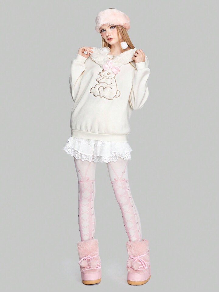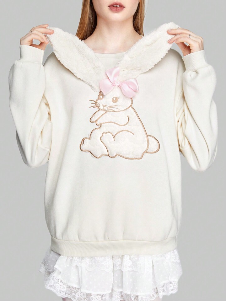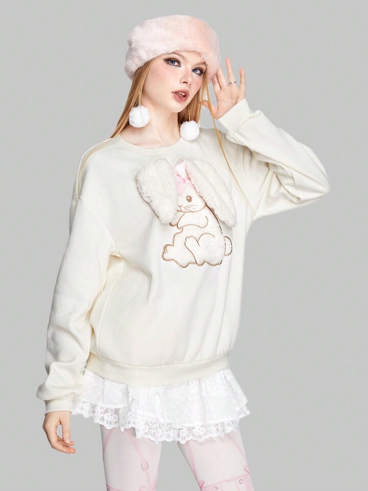 Kawaii Pullover mit Cartoon Hase Stickerei, Drop Shoulder
