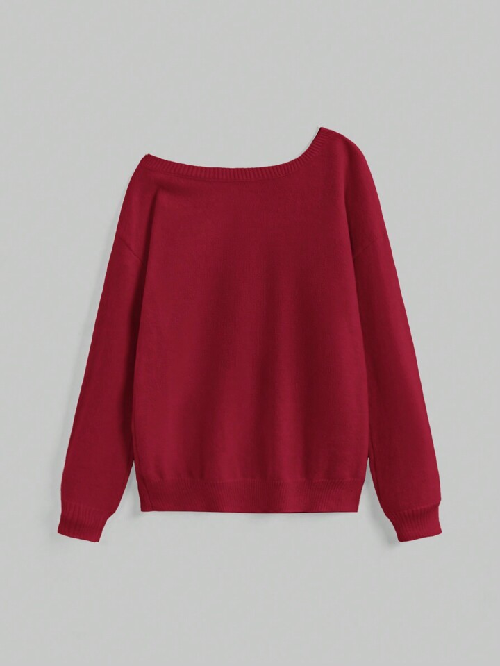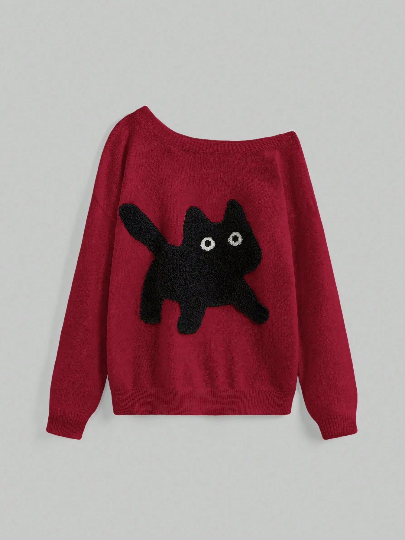 Kawaii Lässiger, süßer Oversize-Pullover mit asymmetrischem Kragen und Katzen-Stickerei für junge Frauen