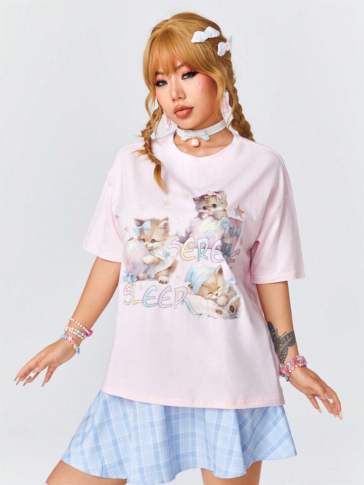 Kawaii Katzen- und Buchstaben bedrucktes T-Shirt mit Dropped Shoulder und Kurzarm, Schule