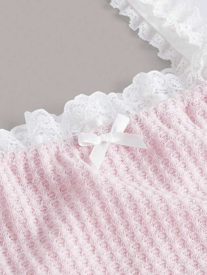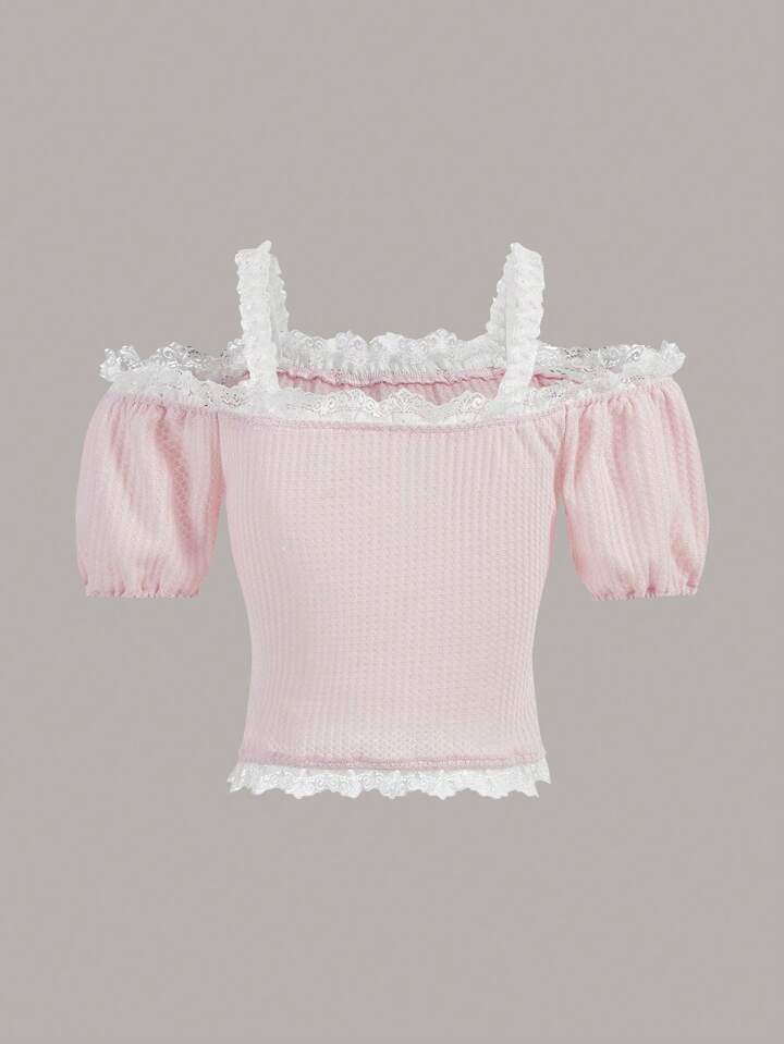Kawaii T-Shirt mit Kontrast Spitzen, schulterfrei
