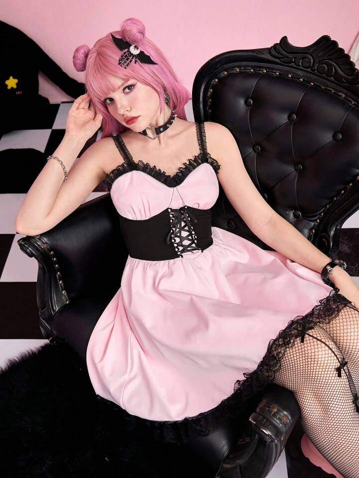 Kawaii Cami Kleid mit Kontrast Spitzen, Band,
