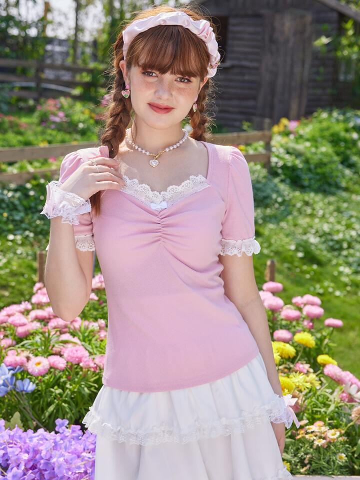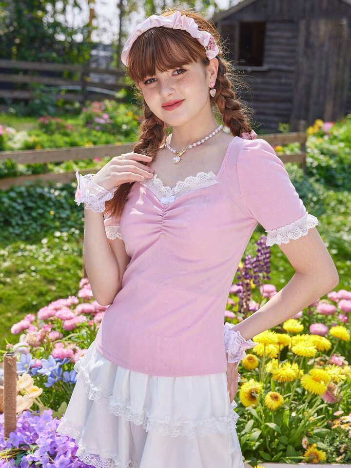 Kawaii Schleifen Durchsichtige Spitze Gerüscht Rippenstrick Einfarbig Lässig Damen T-Shirts