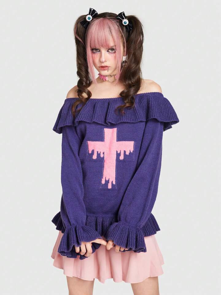 Kawaii Pullover mit Kreuz Muster, schulterfrei Rüschenbesatz
