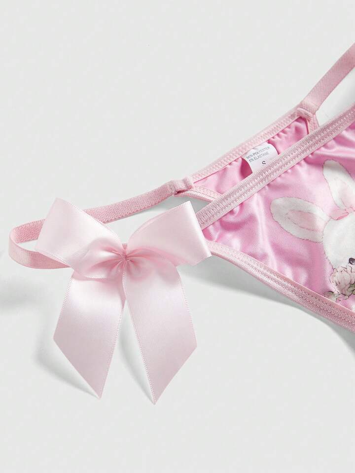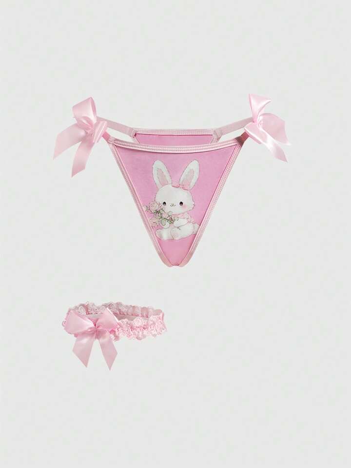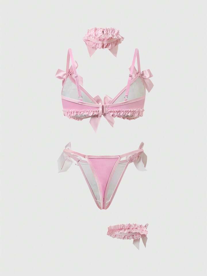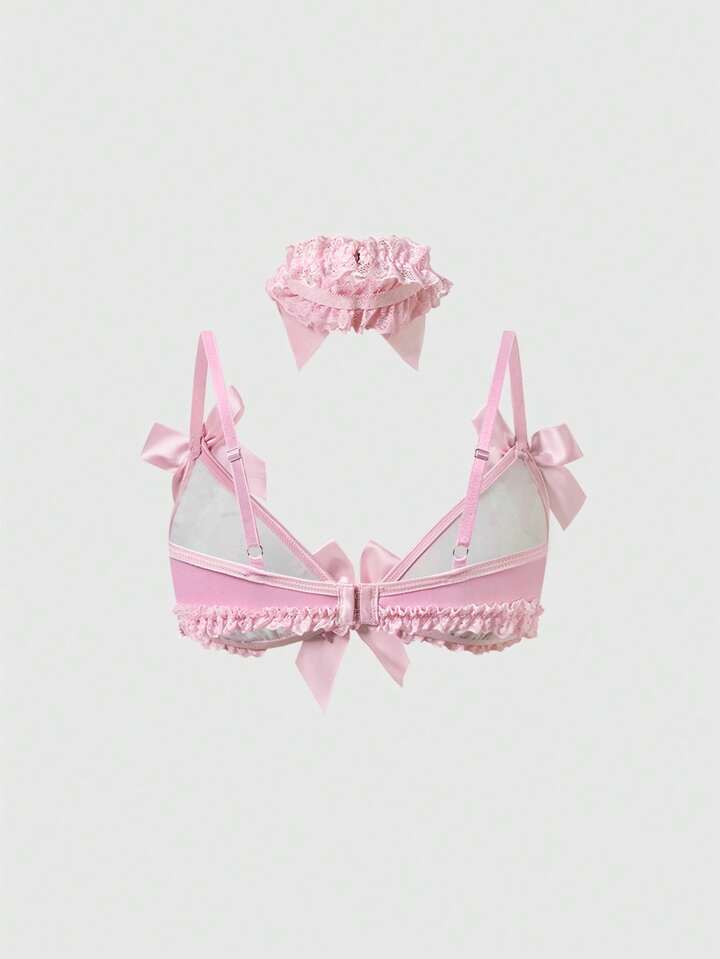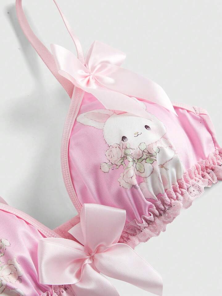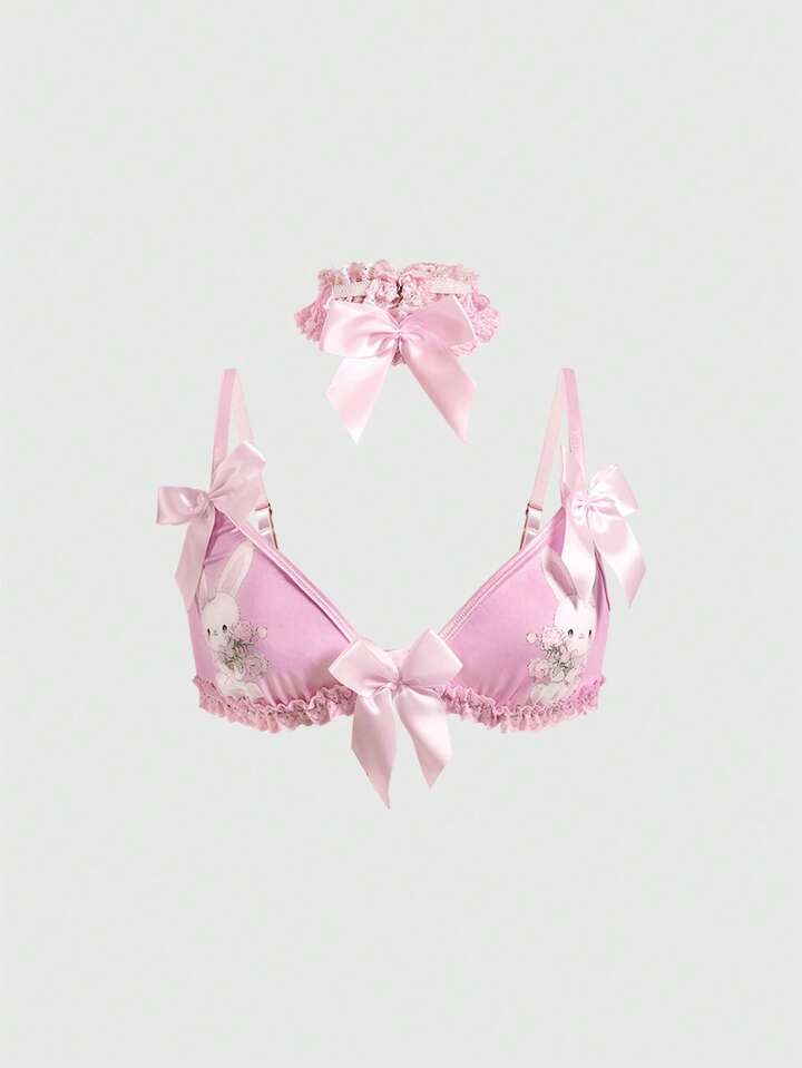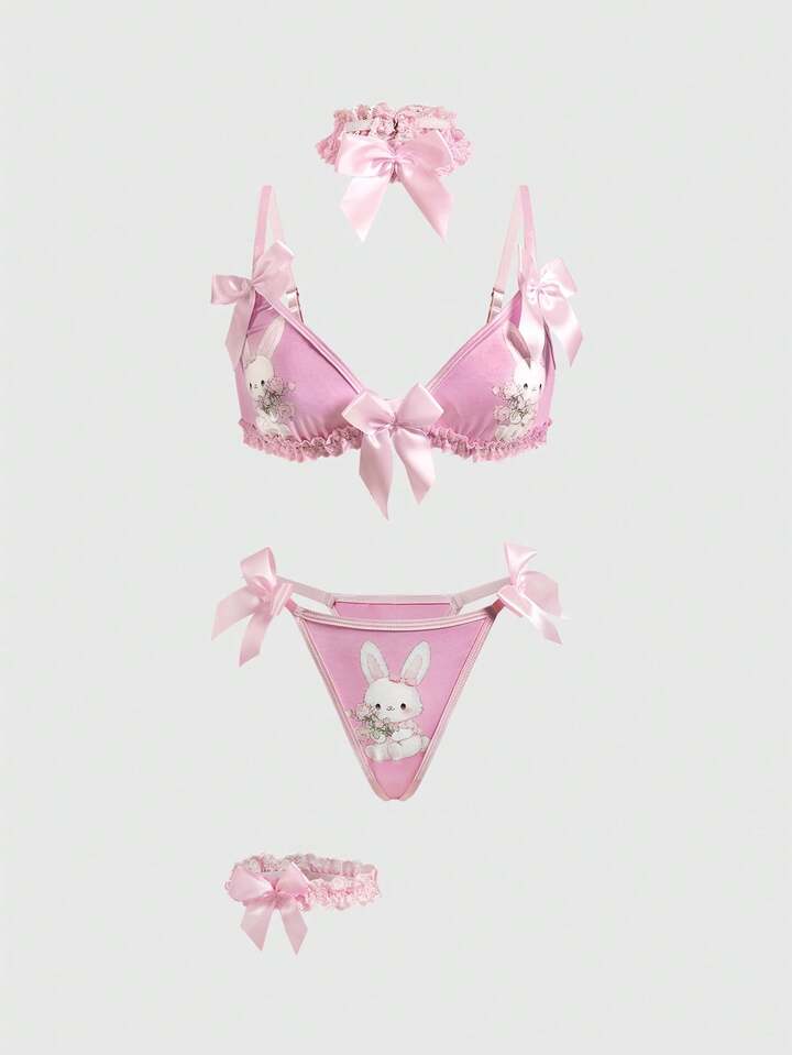 Kawaii Süßer Häschen-Spitzen-BH, String, Choker & Strumpfhalter, sexy Dessous-Set