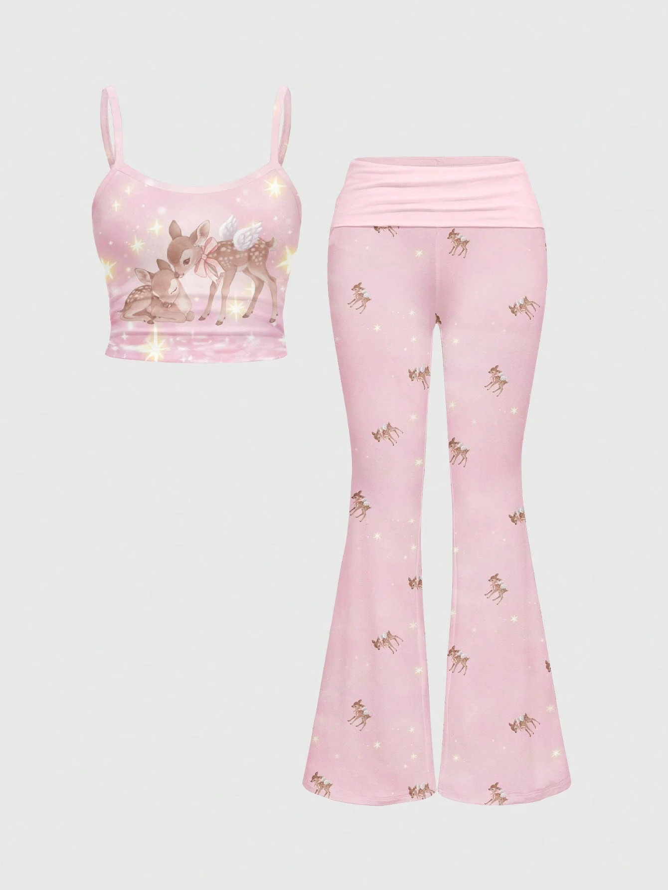 Kawaii Süßer Hirsch Feenflügel & Sternenhimmel romantisch sexy Trägerhemd und ausgestellte Hose mit niedriger Taille Damen 2-teiliges Set, Frühling/Sommer