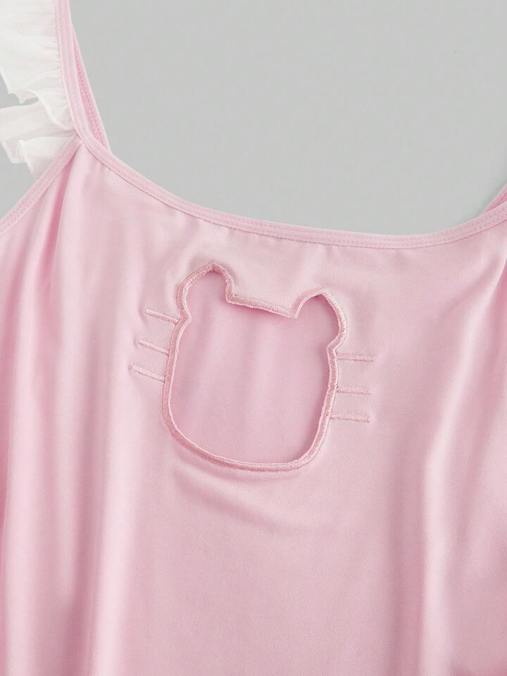Kawaii Niedlicher, Cut Out Katzenstickerei-Rüscheneinsatz Criss-Cross Sexy Bodysuit