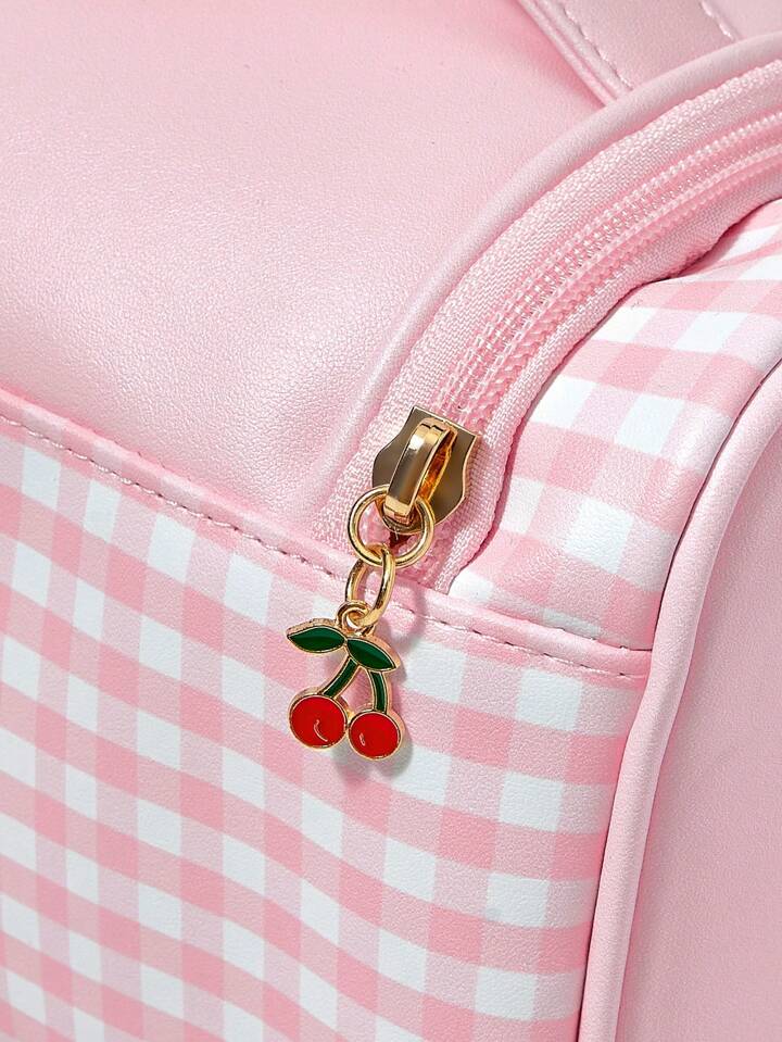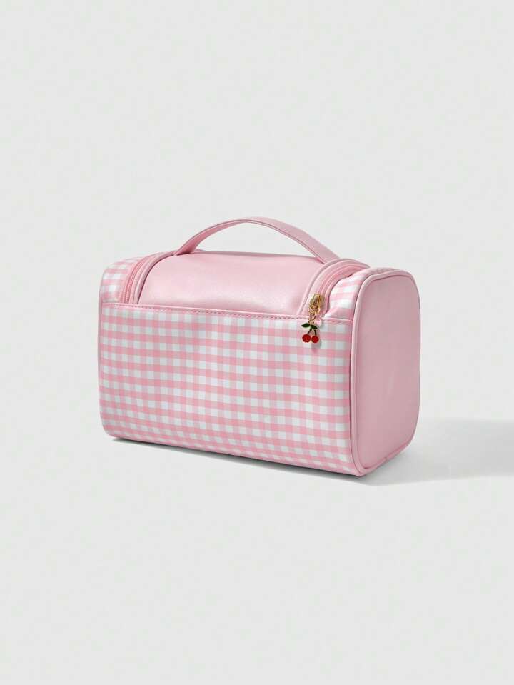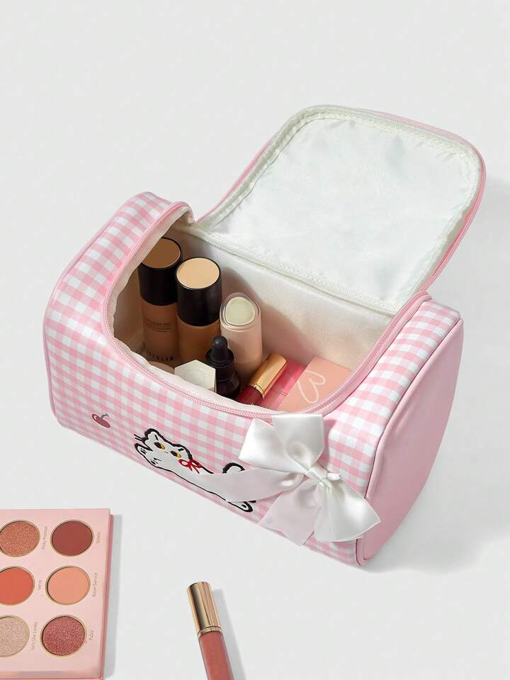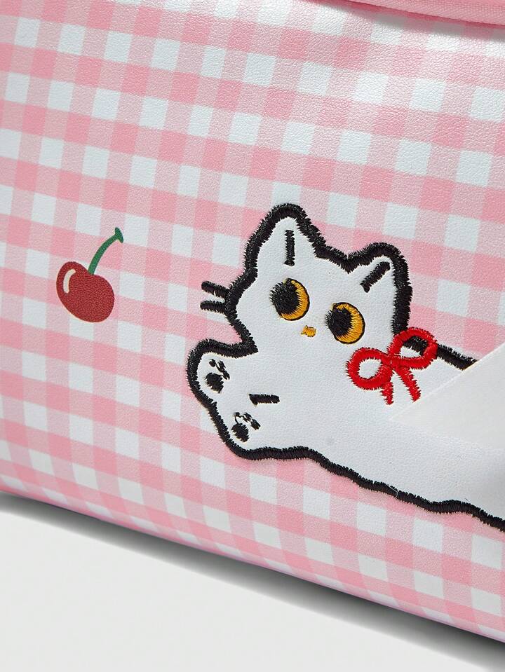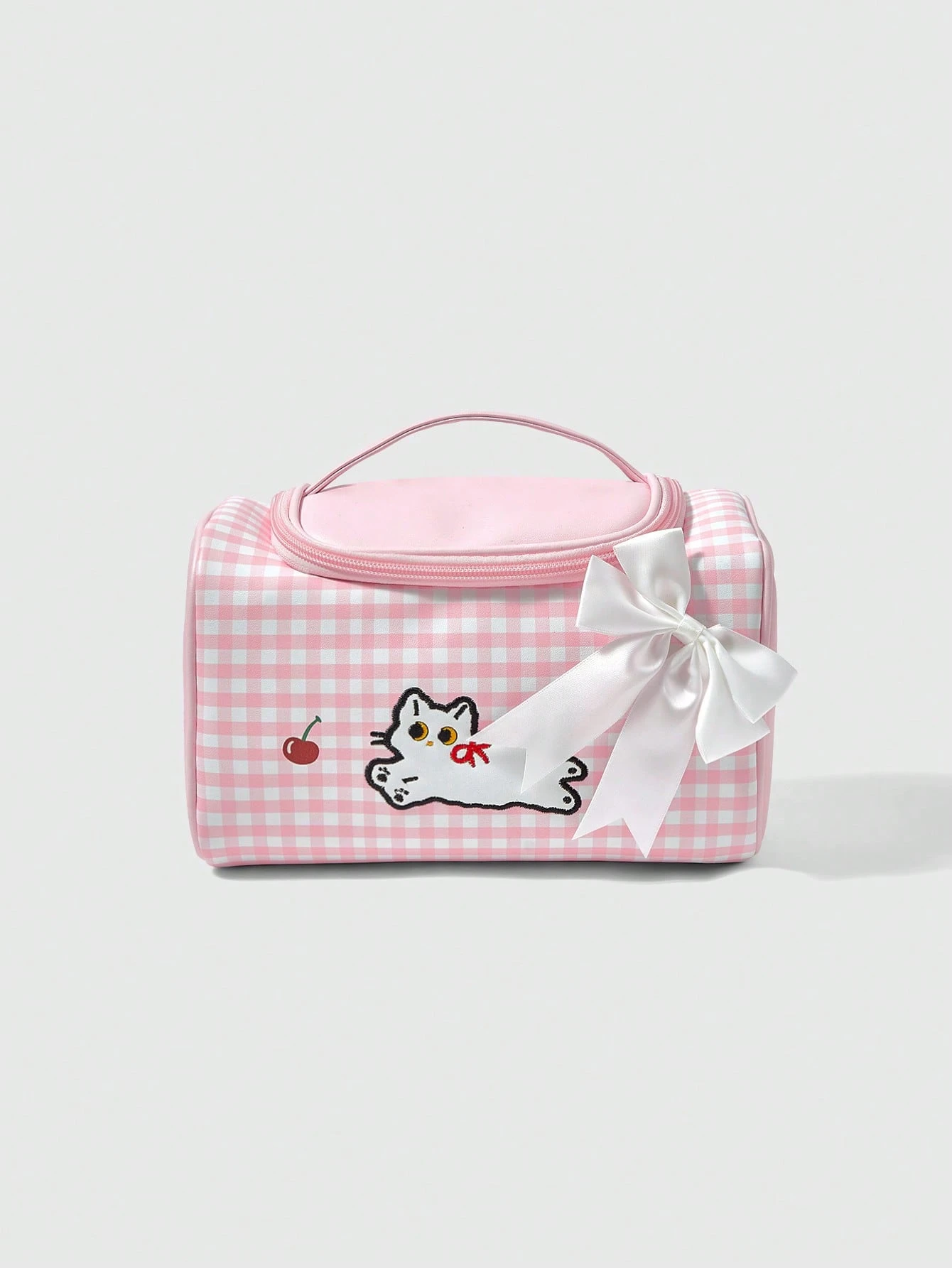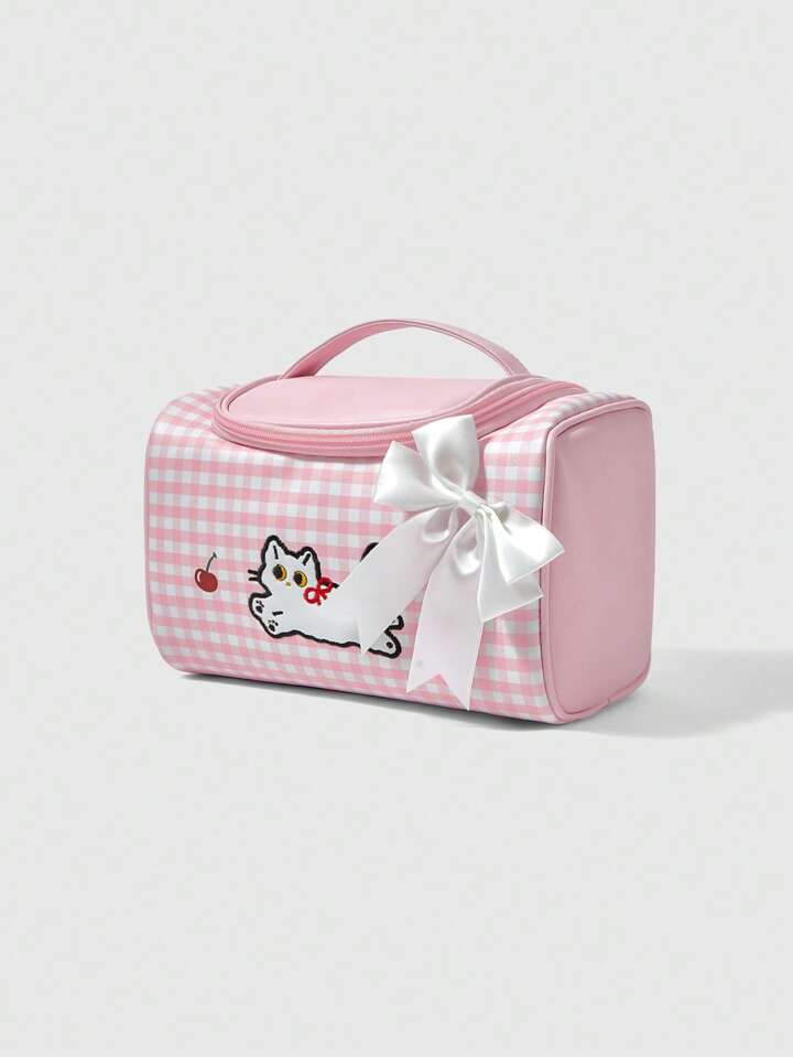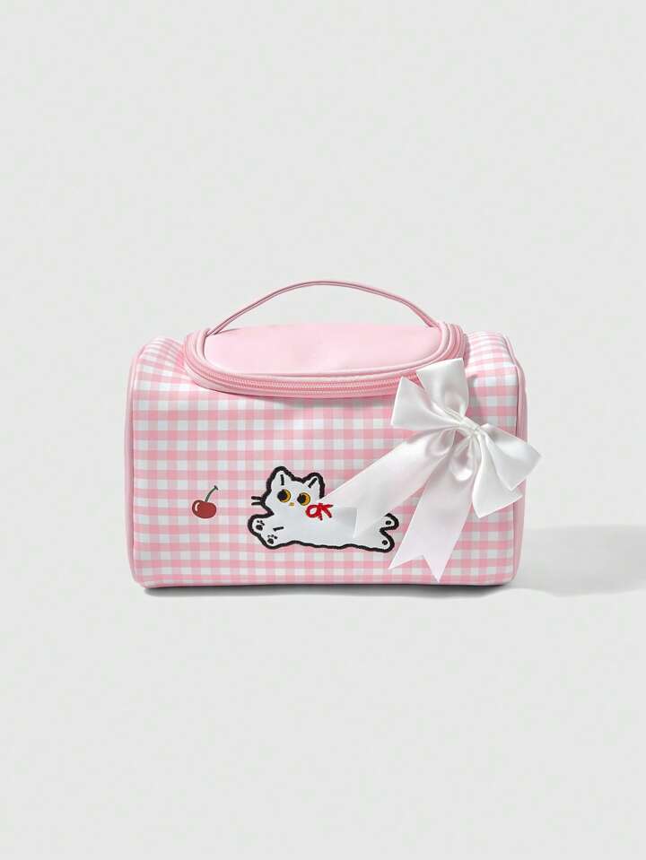 Kawaii Niedlicher pinker karierter Kirsch-Katzen Muster Kosmetiktasche mit großer Kapazität 1368226