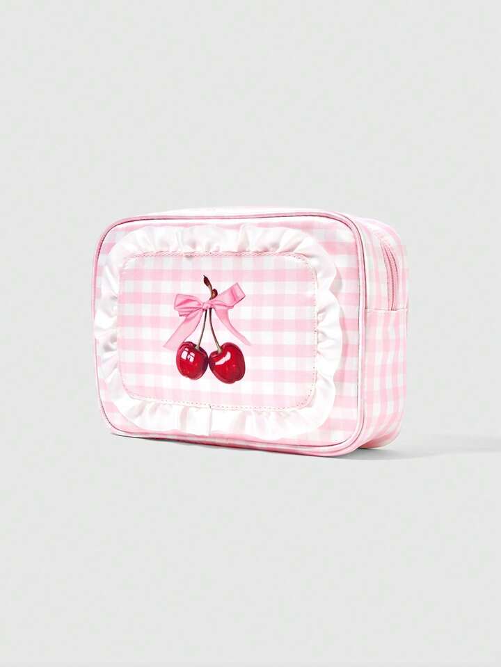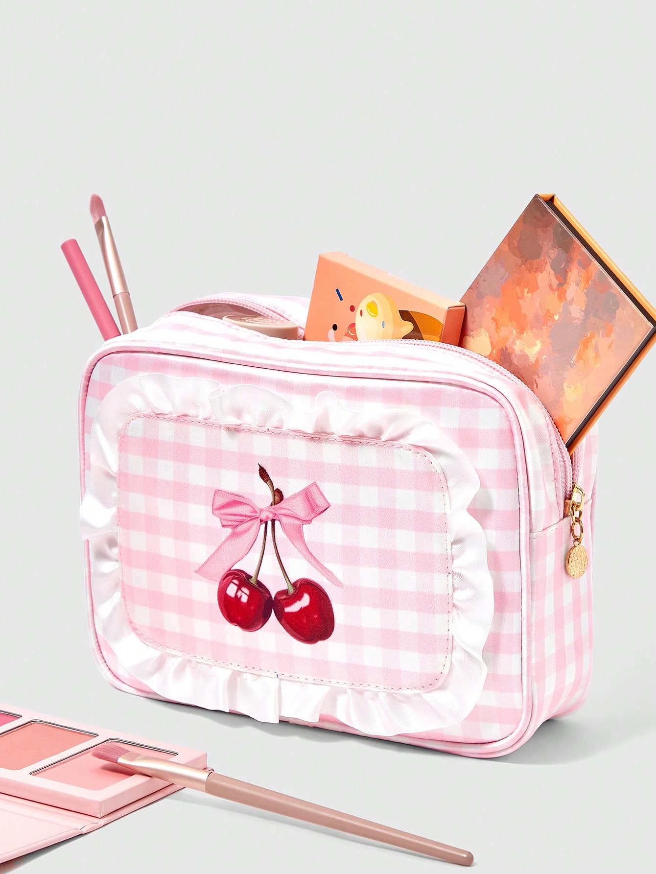 Kawaii Niedliche rosa karierte Kirschmuster große Kapazität transparentes Fenster Make-up Tasche für Frauen