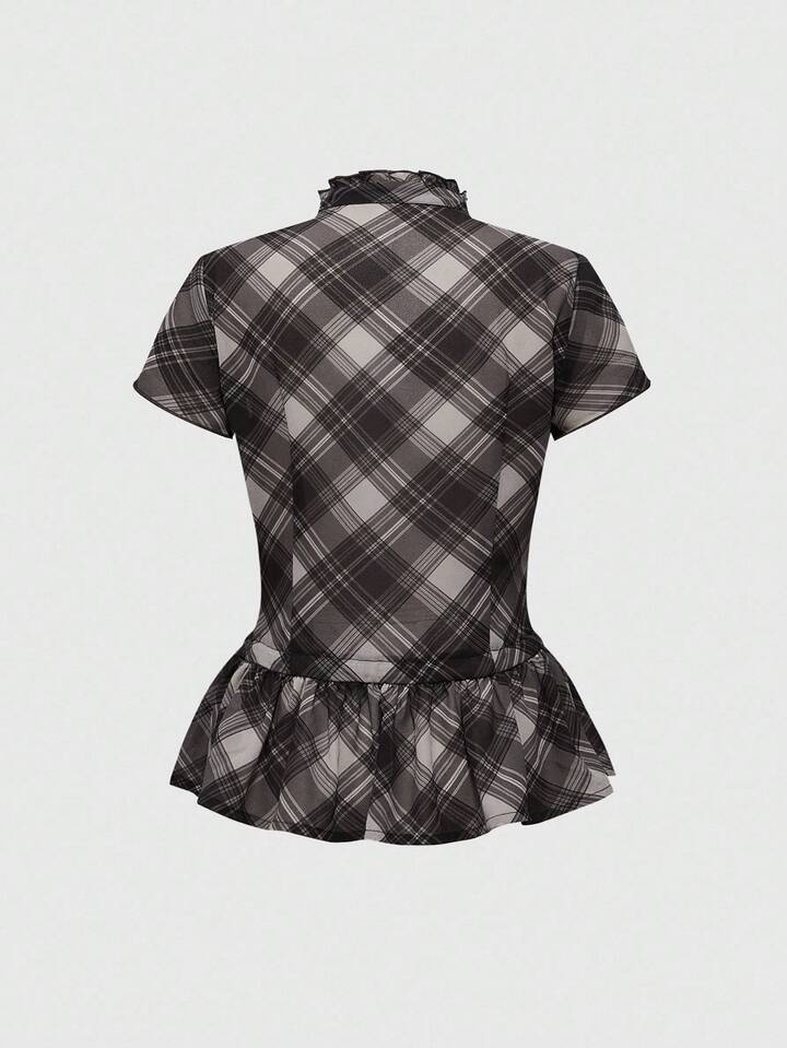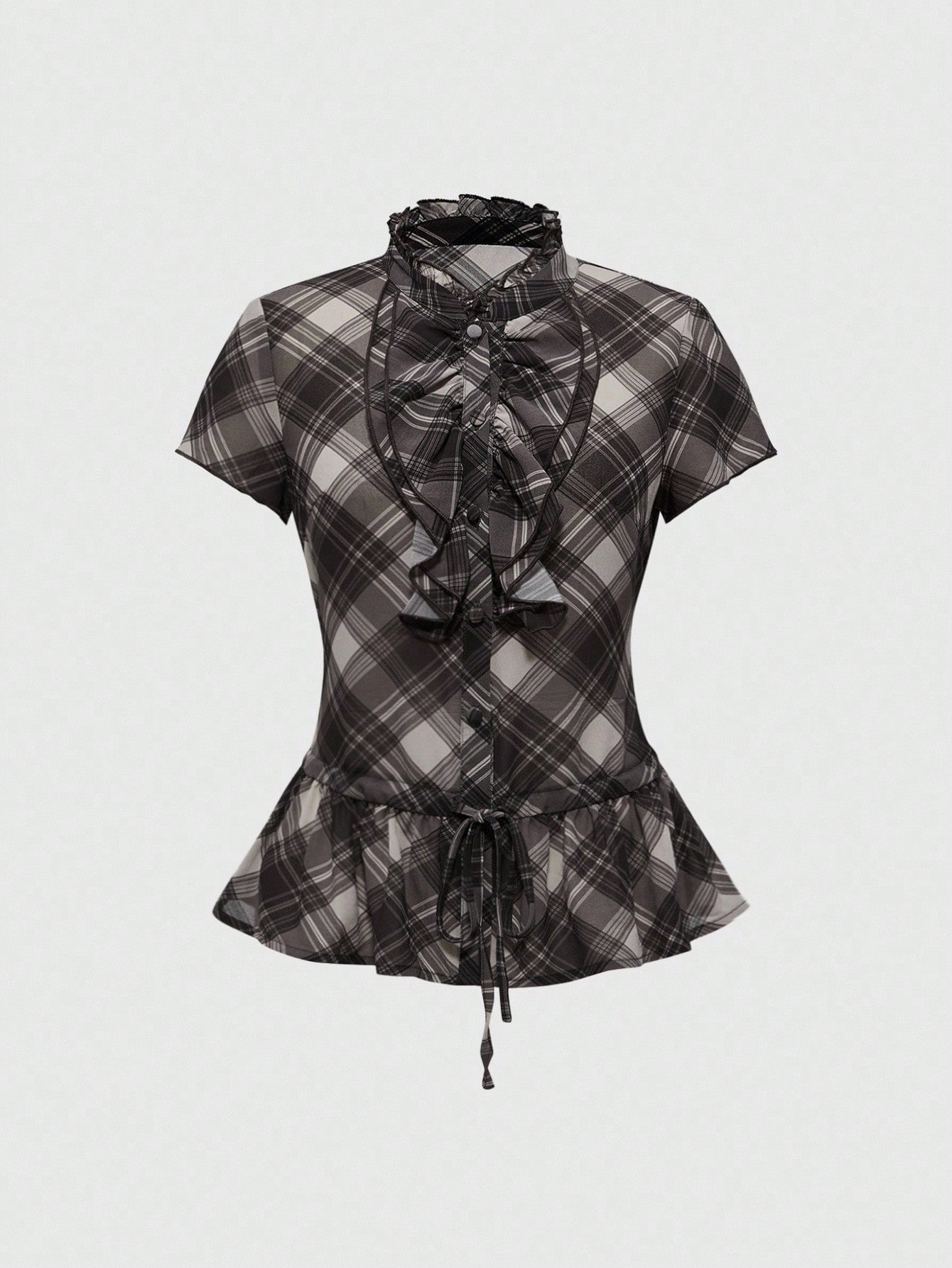 Kawaii Süßes Retro Karomuster Rüschen Saum Tailliertes Kurzarm Hemd