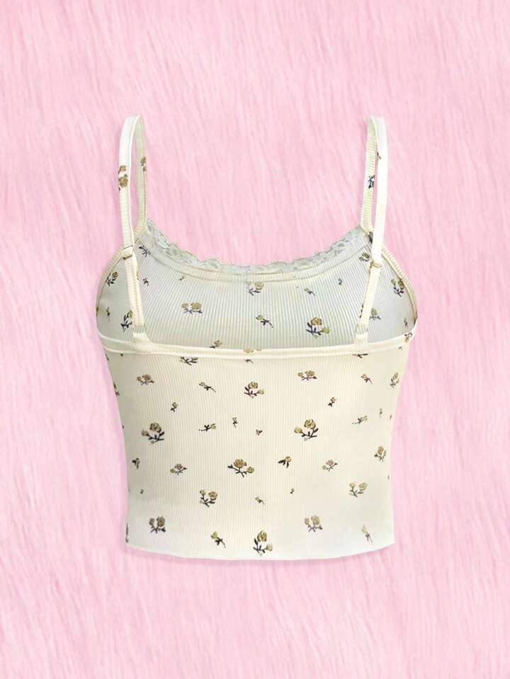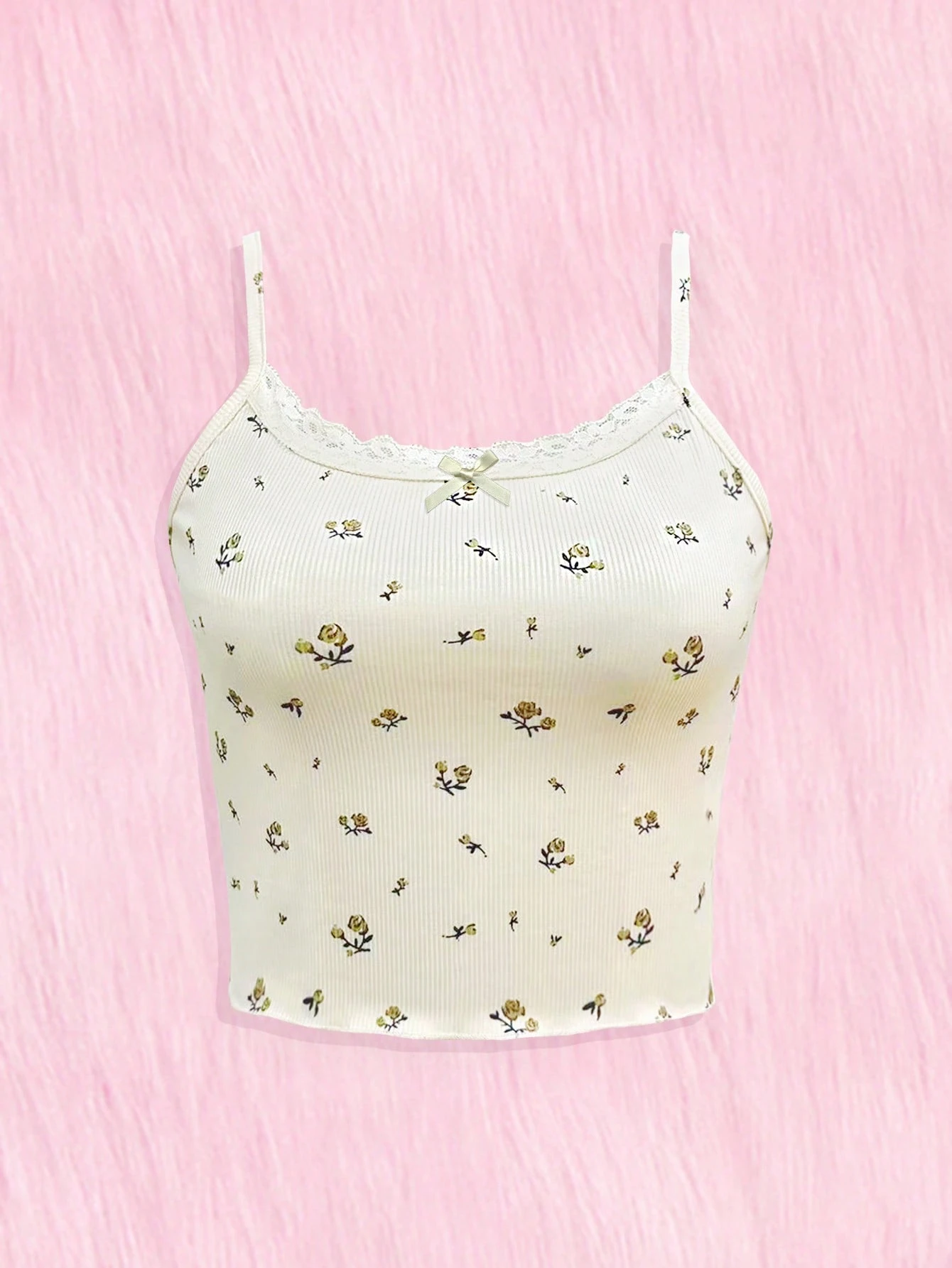 Kawaii Cami Top mit Blümchen Muster, Kontrast Spitzen,