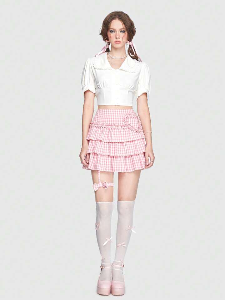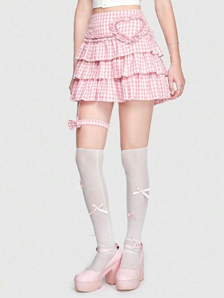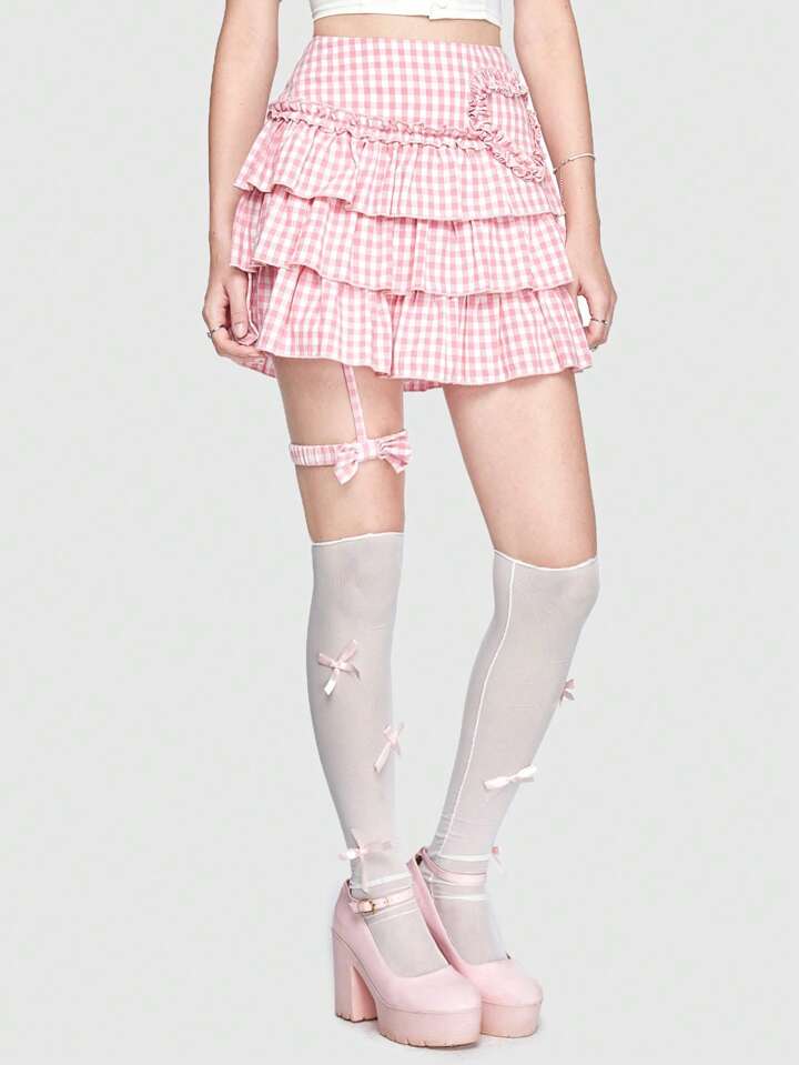 Kawaii Rock mit Gingham Muster, Schleife Dekor, Rüschenbesatz,