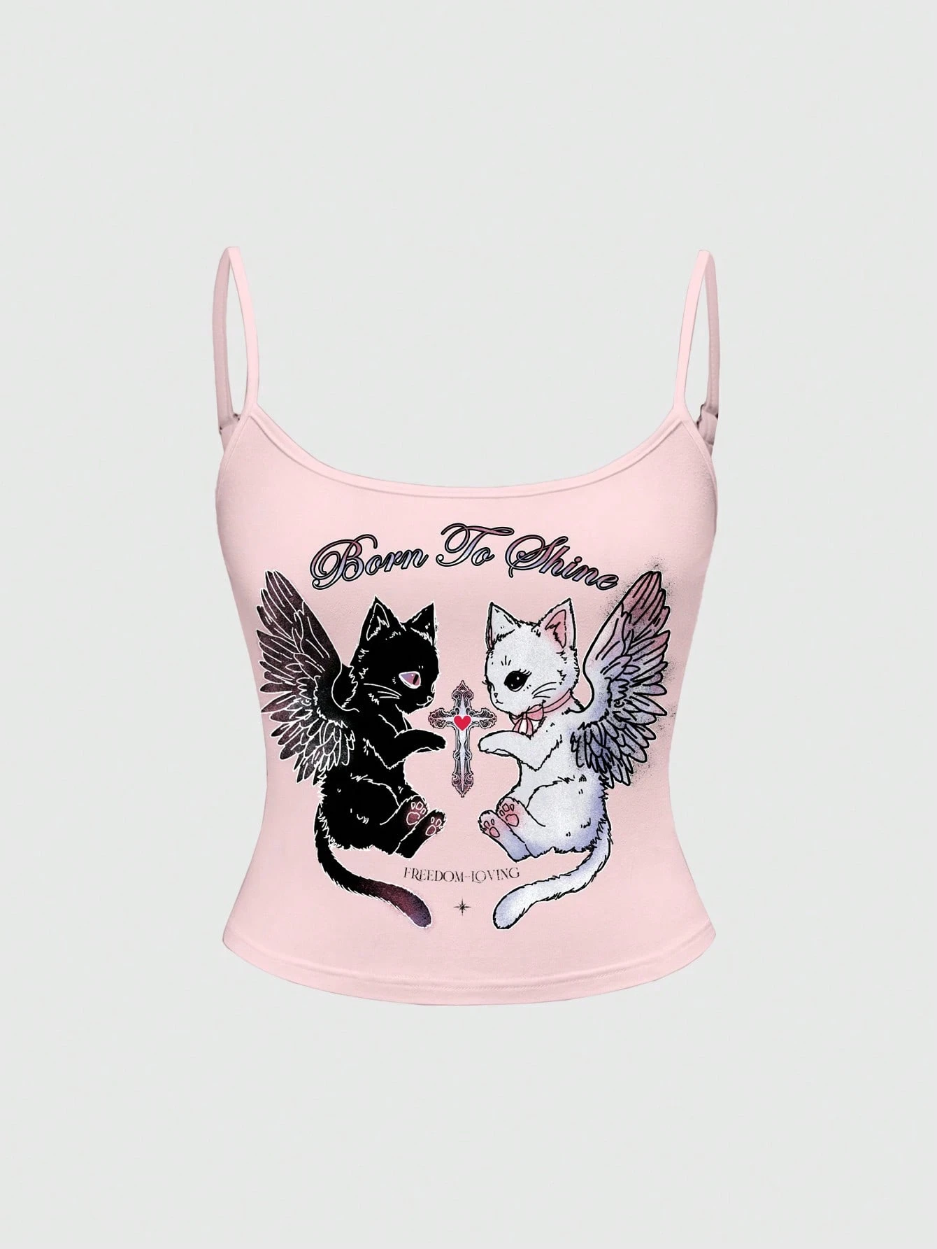 Kawaii Gotisches schwarzes Katzen-Kreuz-Herz Slogan Damen Trägerhemd