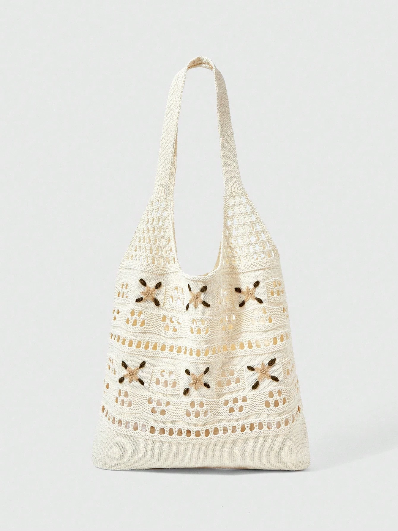 Kawaii Gehäkelte gestrickte Blumen Tragetasche, Damen Schultertasche mit Stickerei, im Mori-Girl-Stil