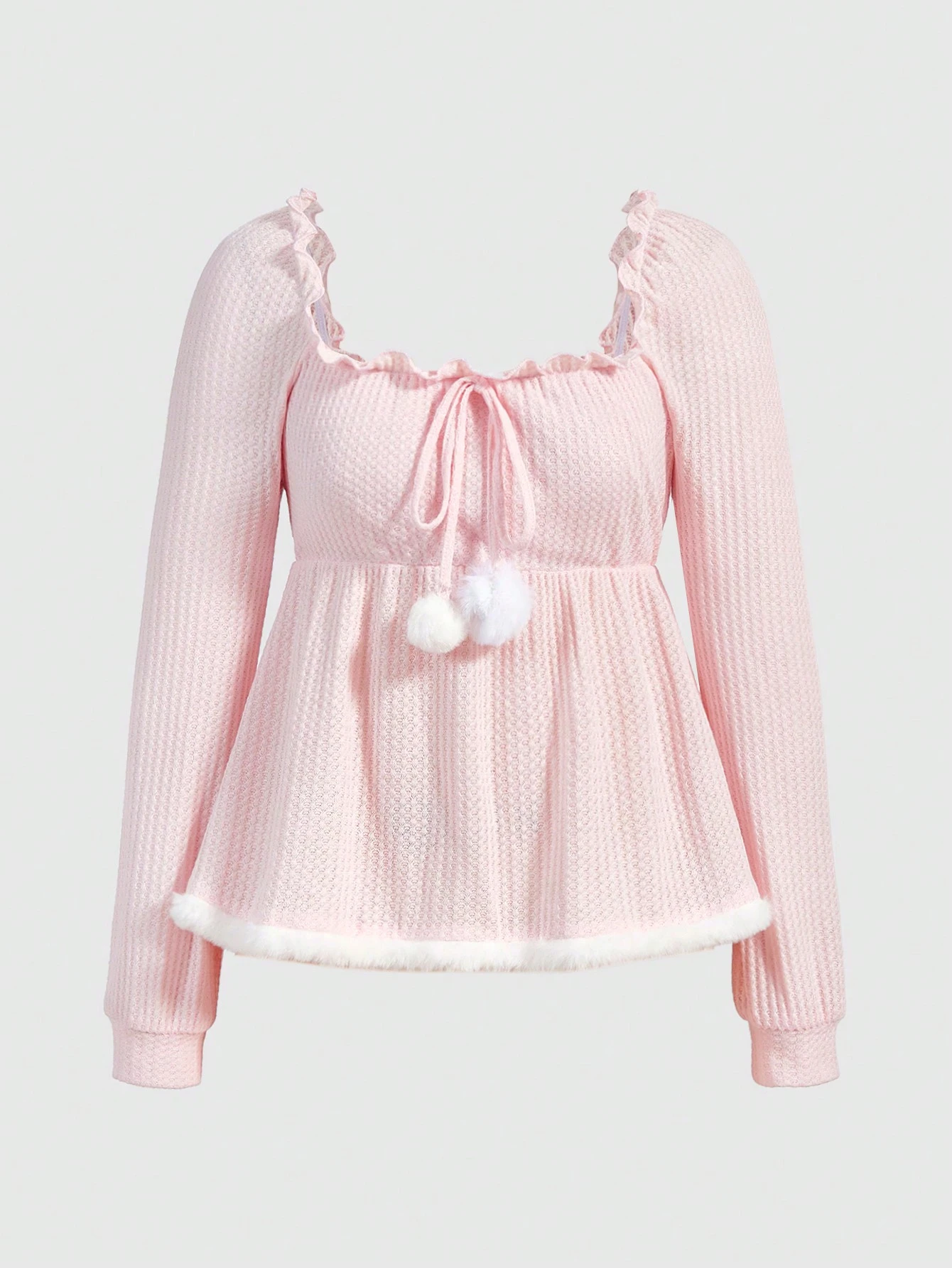 Kawaii Langarm T-shirt Mit Pom Pom Dekoration