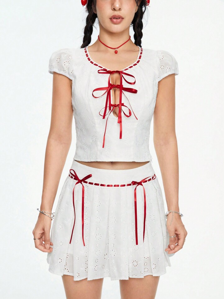 Kawaii Schönes Kontrast-Schleife entworfenes Jacquard-Textur Zweiteiler für Frauen