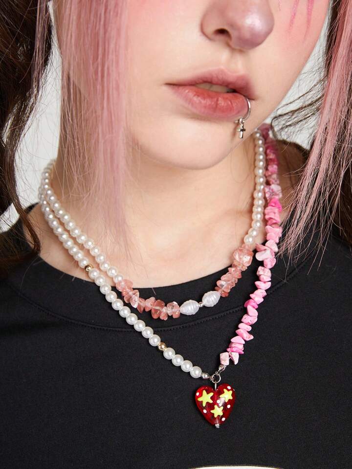 Kawaii Pinkfarbene Halskette In Herzform Aus Kristall, Stein Und Unechten Perlen