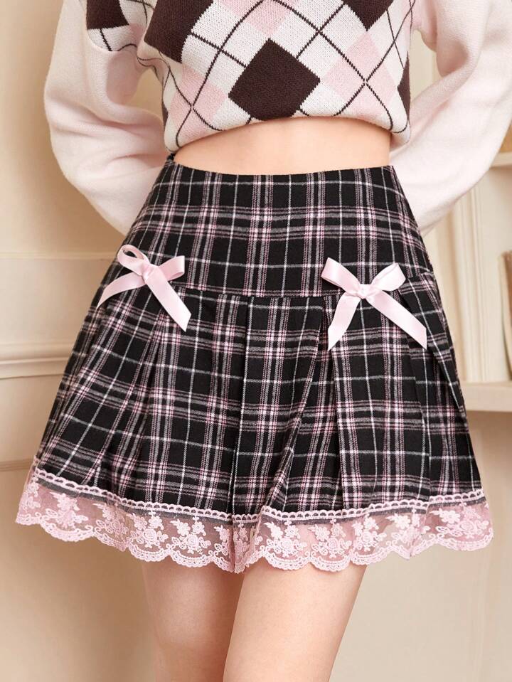 Kawaii Faltenrock mit Plaid Muster, Spitzenbesatz,