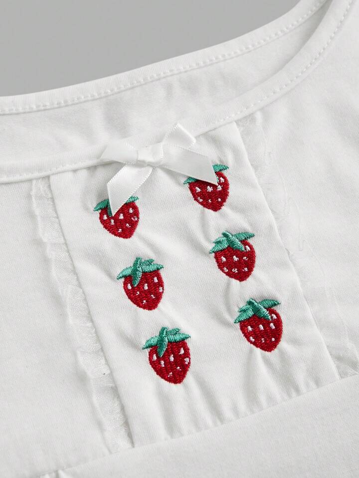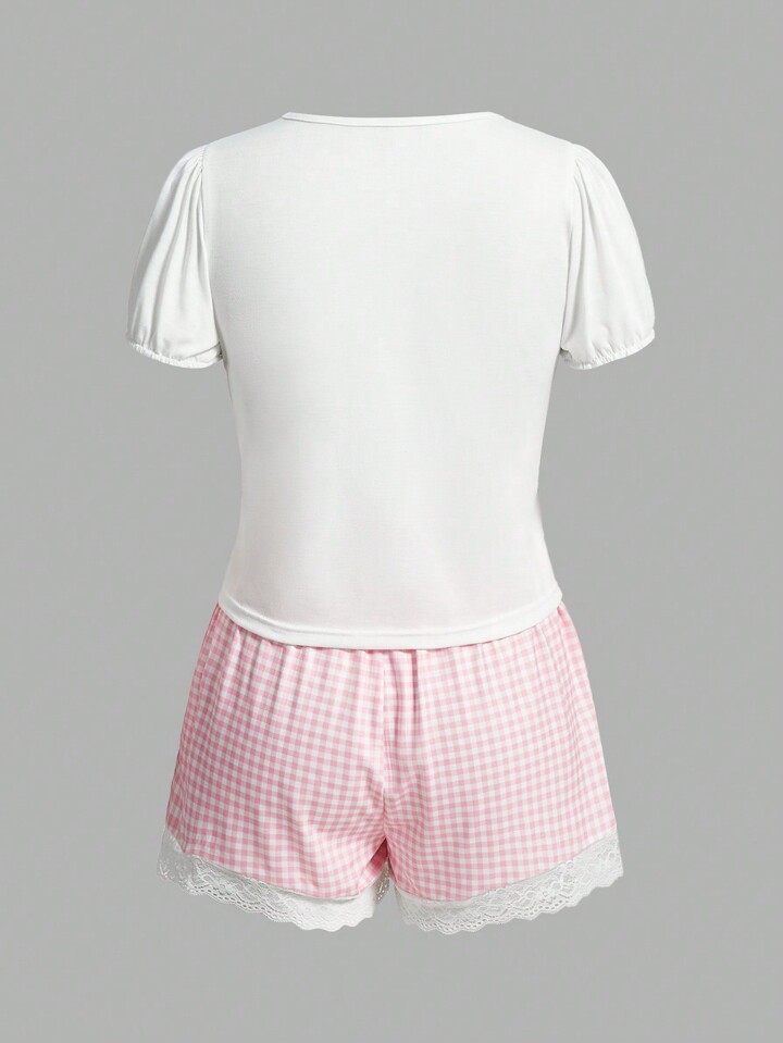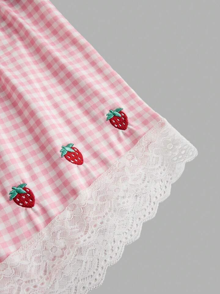 Kawaii Karo Puffärmel Pyjama Set Mit Erdbeer-stickerei