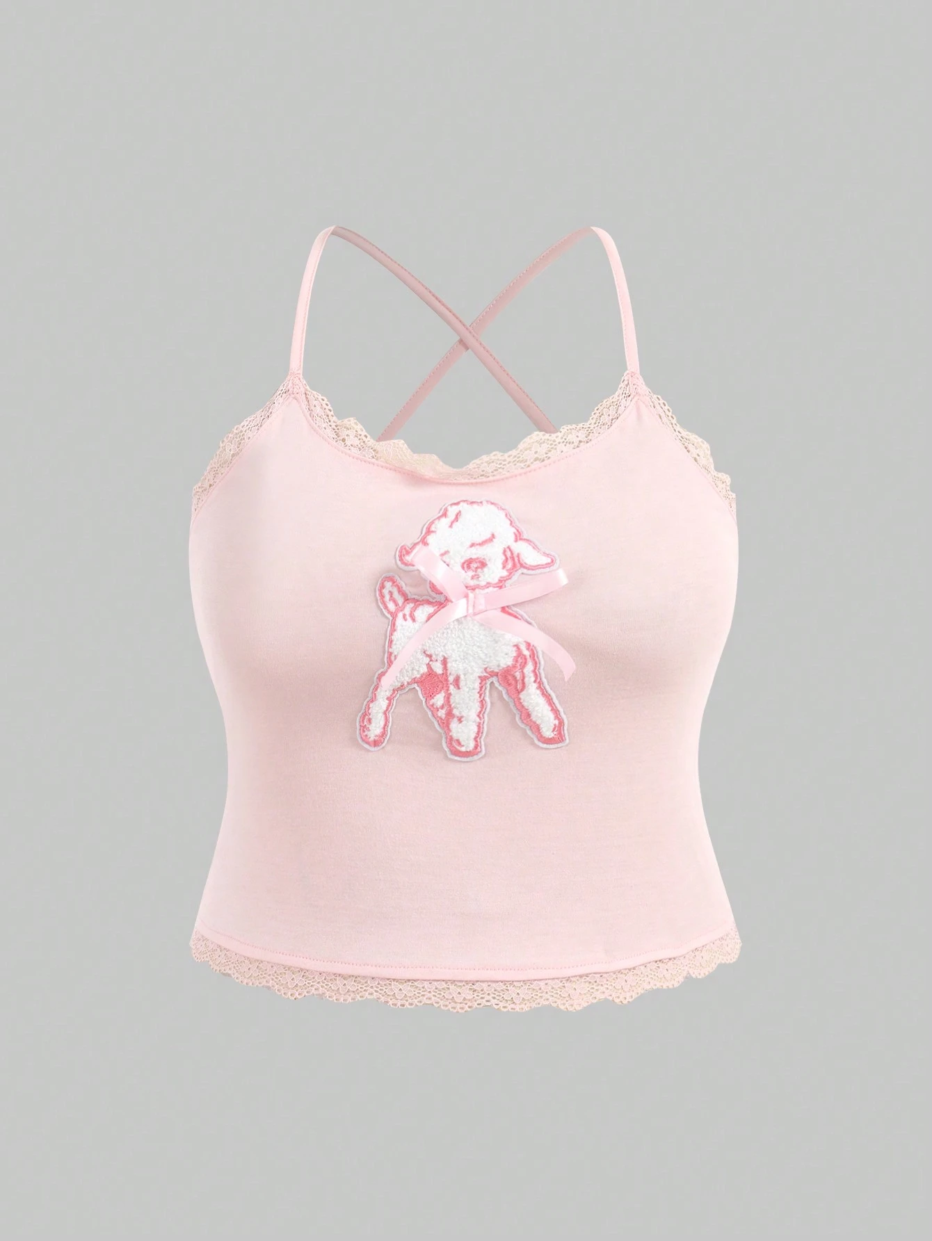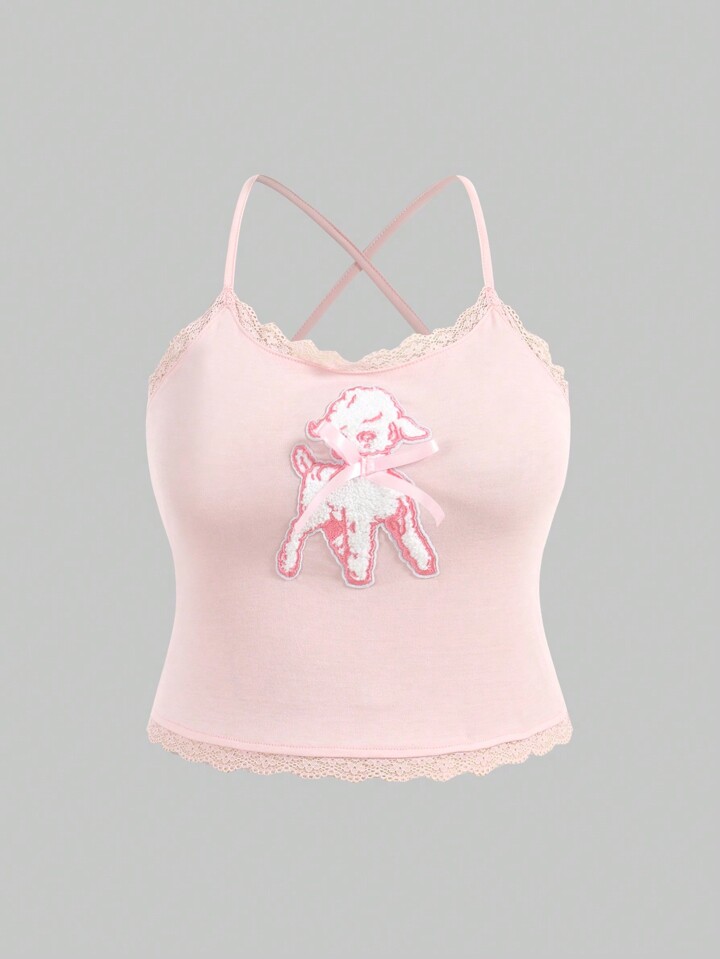 Kawaii Große Größe Cami Top mit Schaf Grafik, Spitzenbesatz,