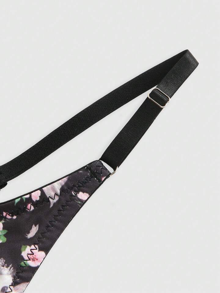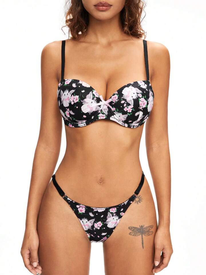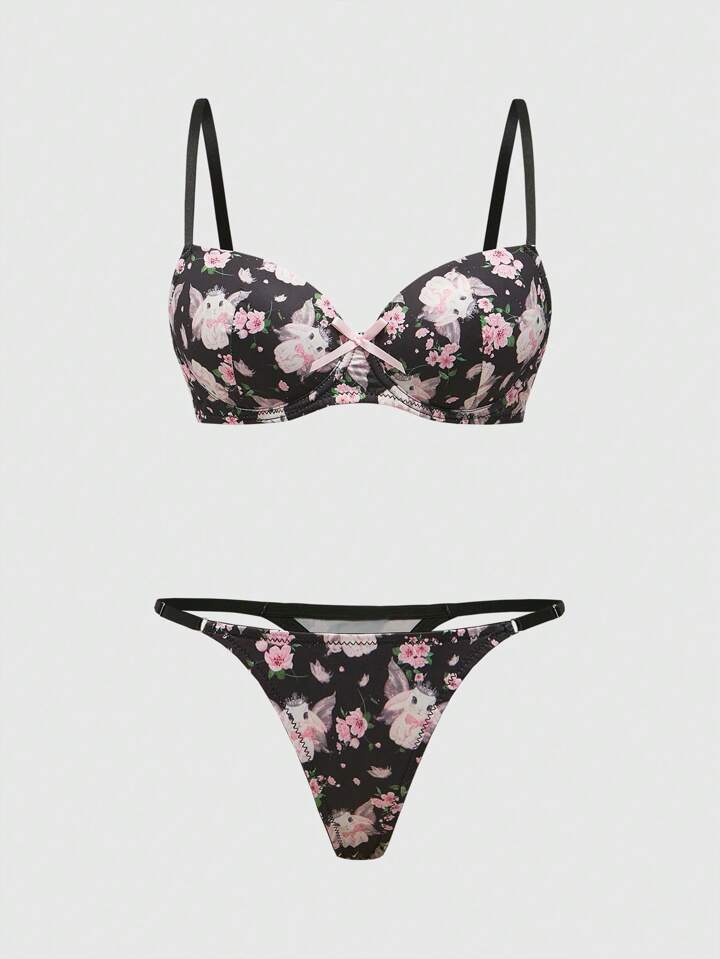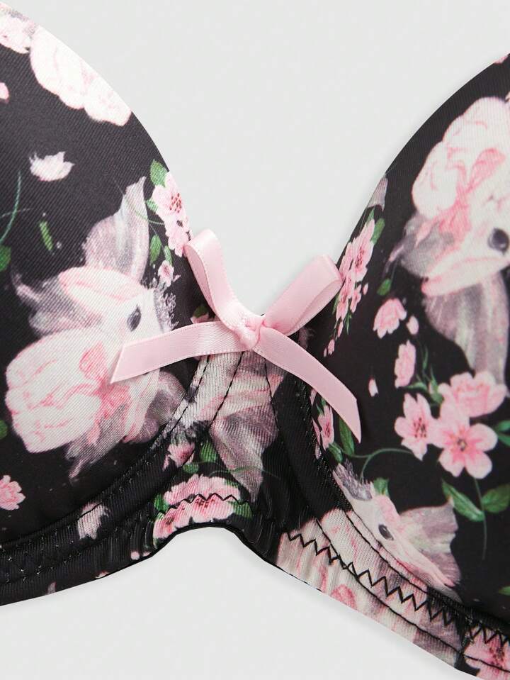 Kawaii Kaninchen, Schmetterling und Blumen gemustertes gepolstertes Push-Up BH- und Unterhosen Set für Frauen ohne Kabel
