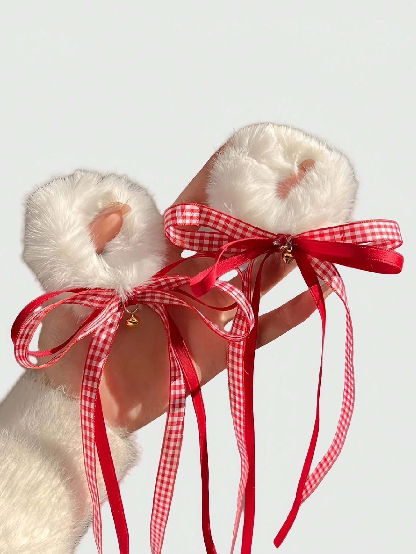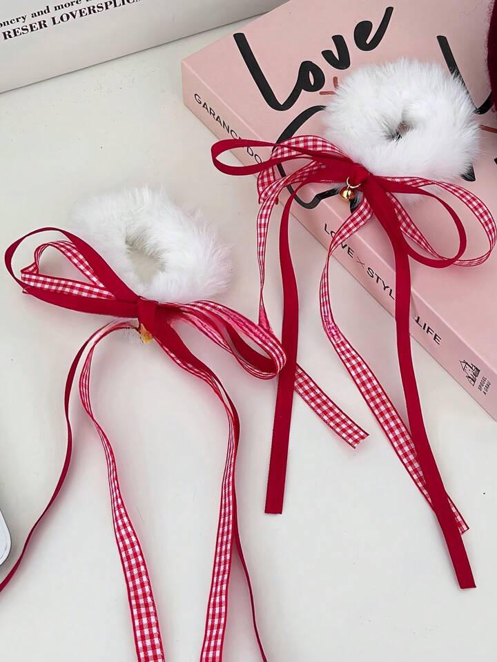 Kawaii Rote karierte Schleifenband Flauschige Haargummis, süß und energiegeladen für Mädchen