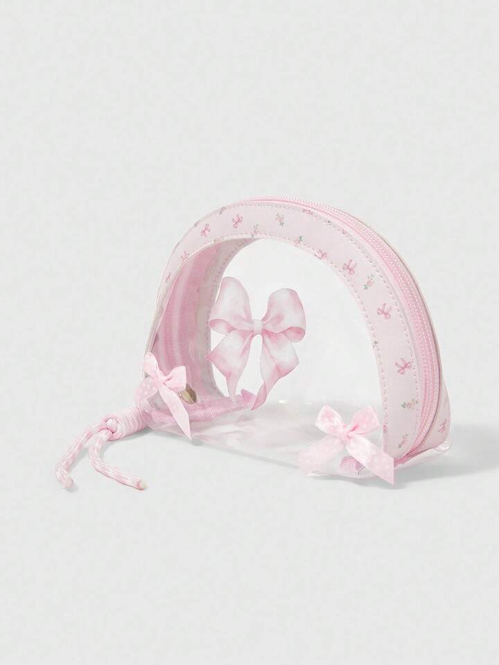 Kawaii Halbkreisförmige, transparente PVC Kosmetiktasche mit süßer, mädchenhafter, rosa Schleife, hohe Kapazität, Artikelnr. 401422