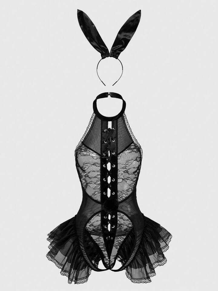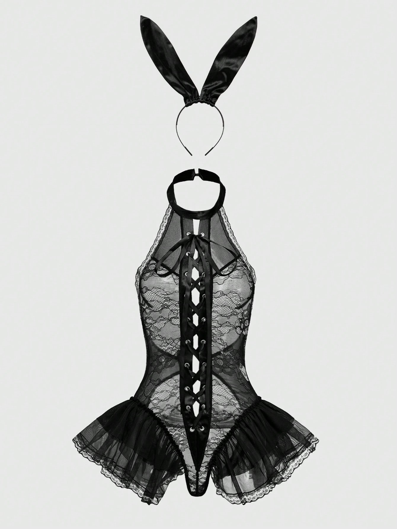 Kawaii Sexy Spitzen- und Mesh-Hasen-Neckholder-Rückenfrei-Bodysuit mit Haarband