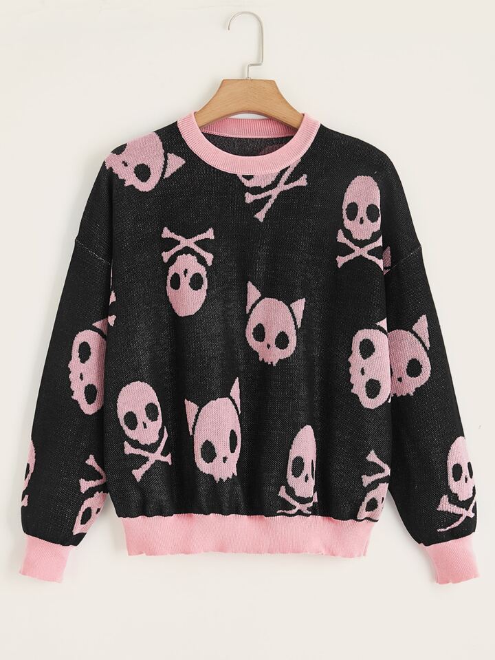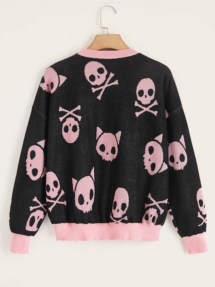 Kawaii Pullover mit Schädel Muster, Drop Shoulder