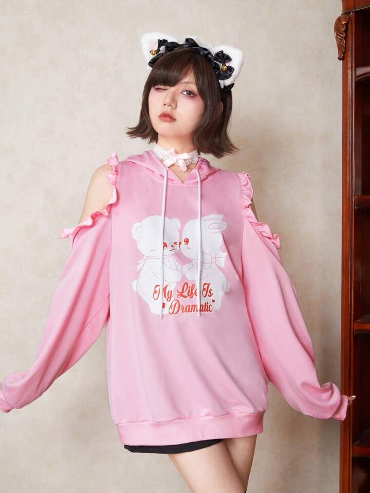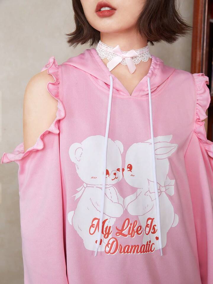 Kawaii Hoodie mit Buchstaben Cartoon Grafik, schulterfrei Rüschenbesatz, Tunnelzug,