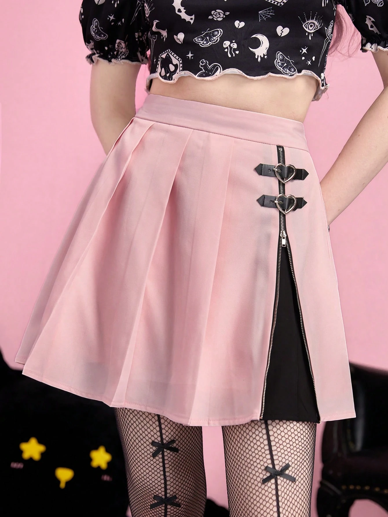 Kawaii Faltenrock mit einfarbig Schnalle, seitlichem Reißverschluss,