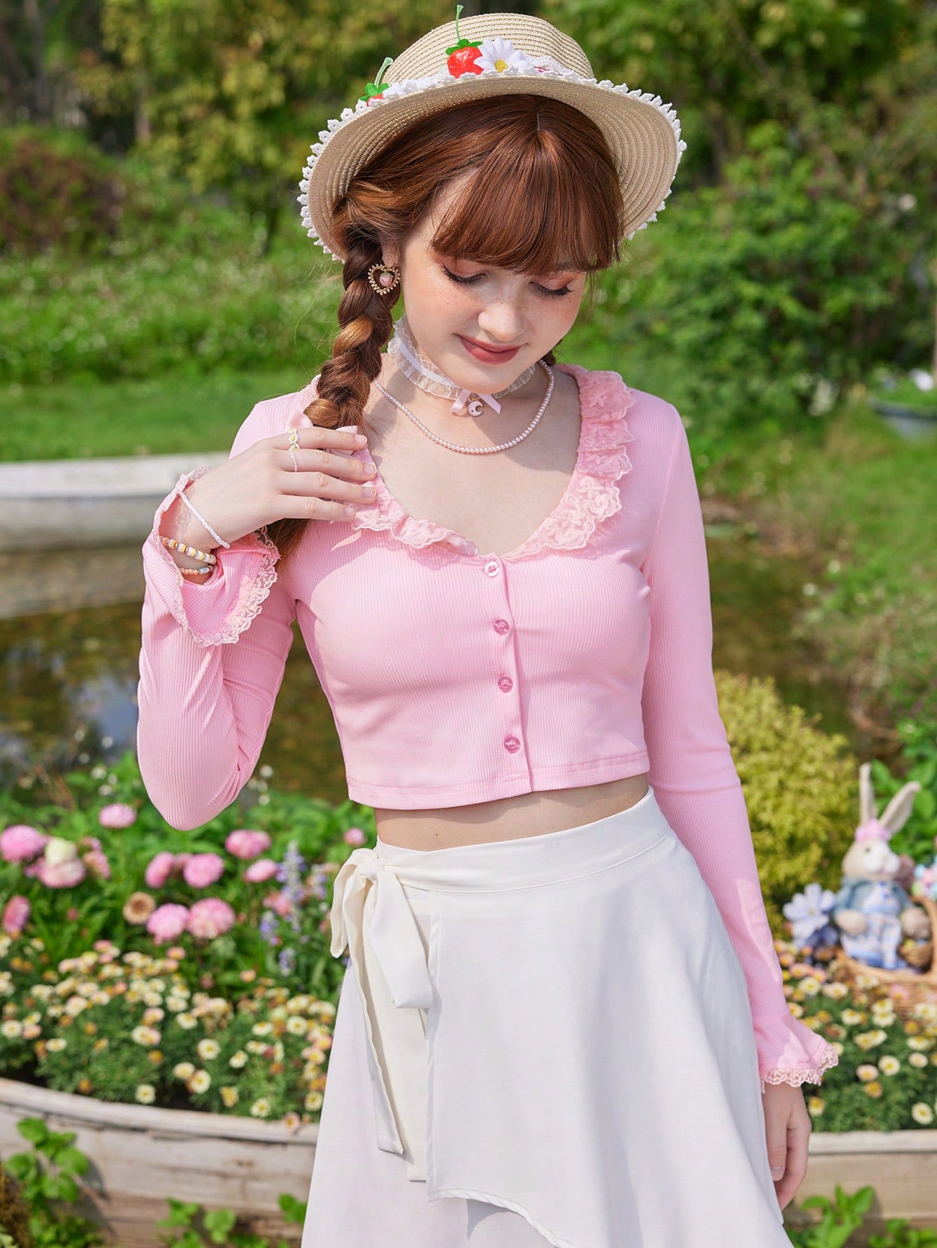 Kawaii Crop T-Shirt mit Spitzenbesatz, Knopf vorne,
