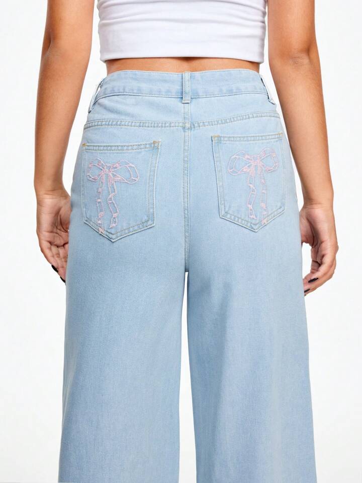 Kawaii Gerade, weite Lässig Jeans mit Schlupftasche, Schleife und Stickerei, vielseitig einsetzbar für Pendler, frisch und niedlich aussehend