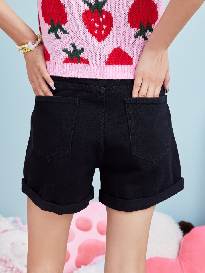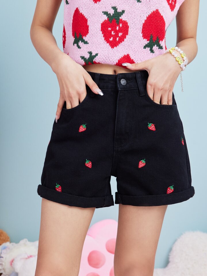 Kawaii Denim Shorts mit Erdbeere Stickerei